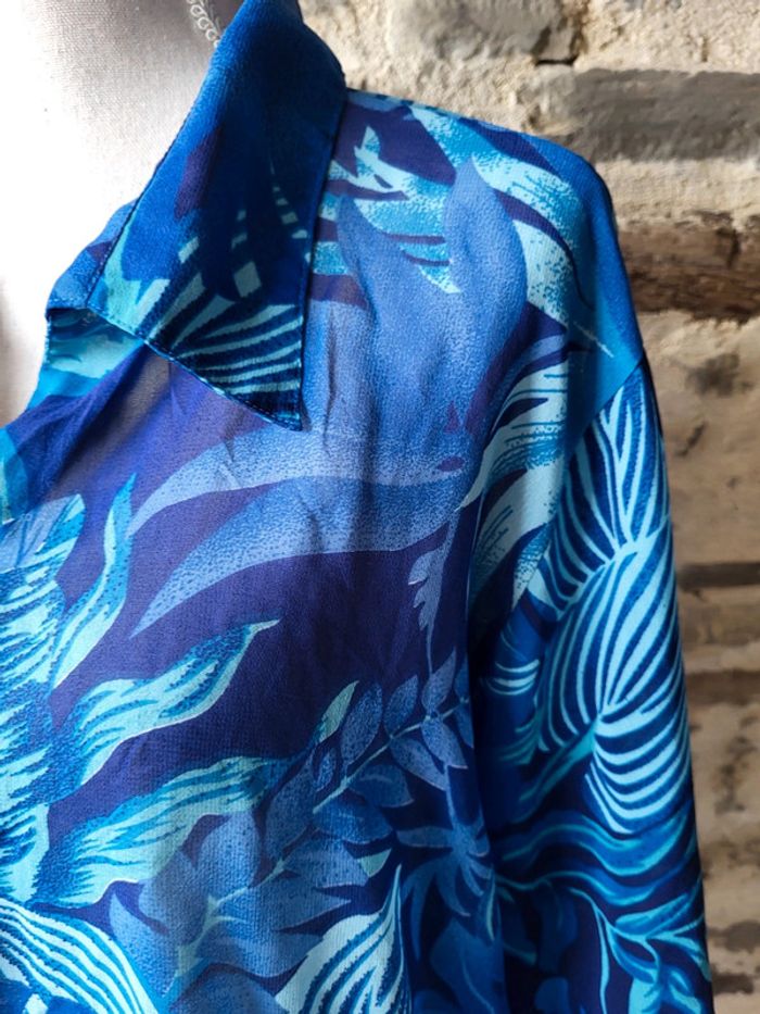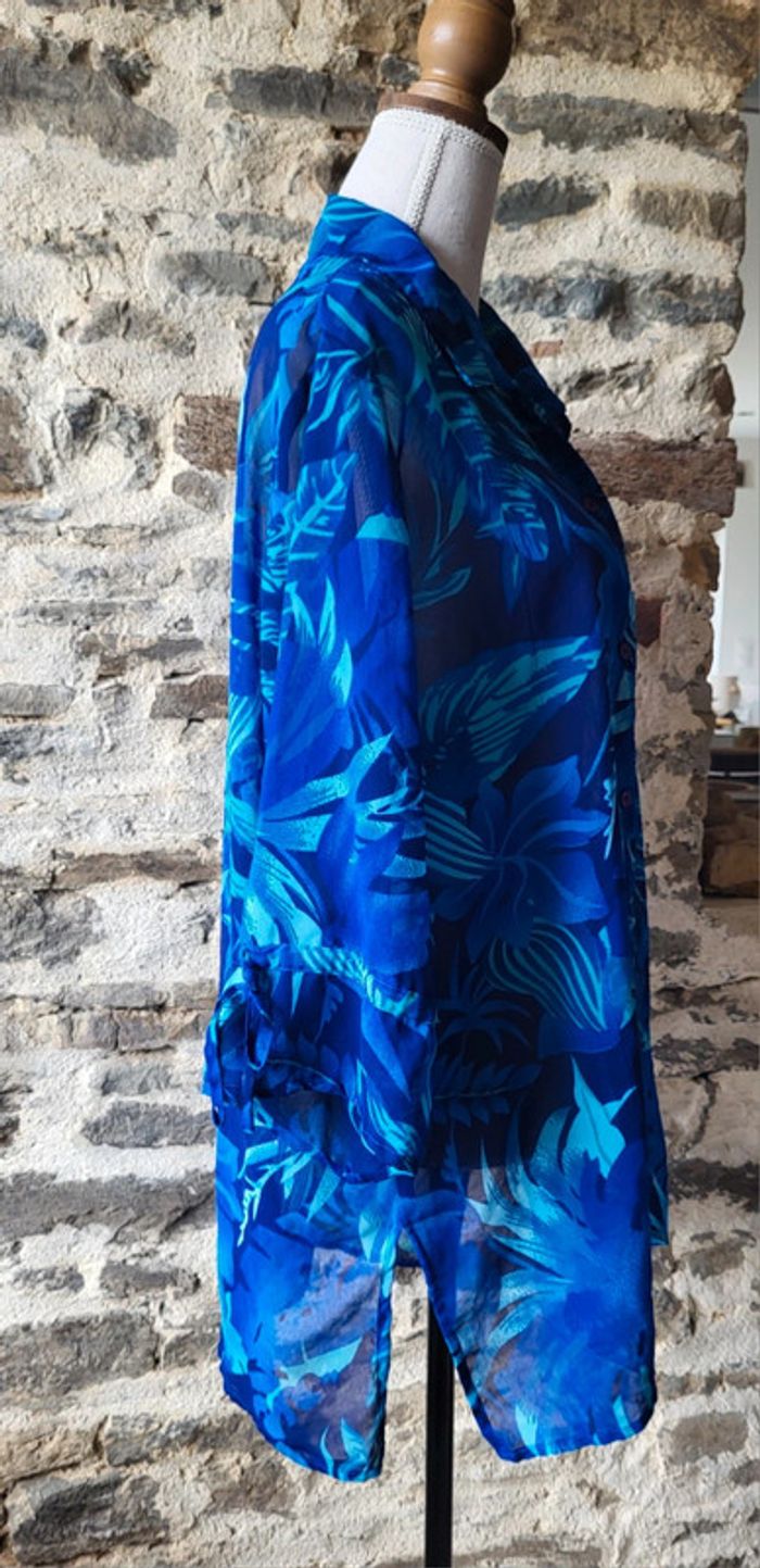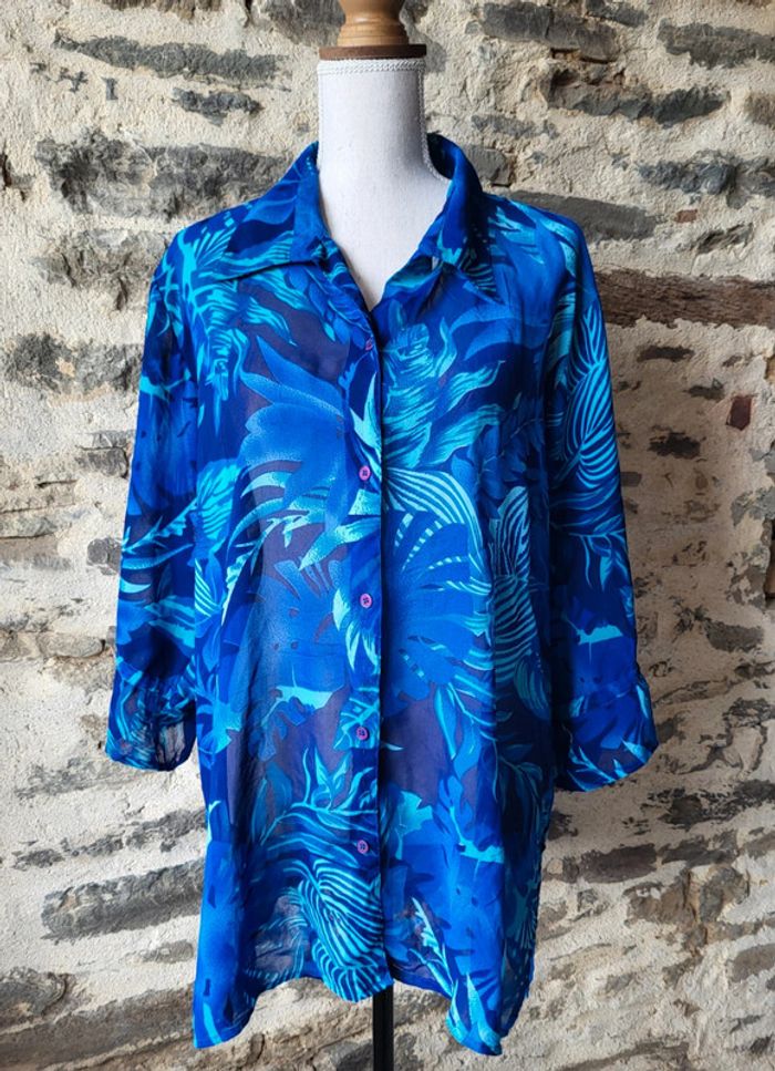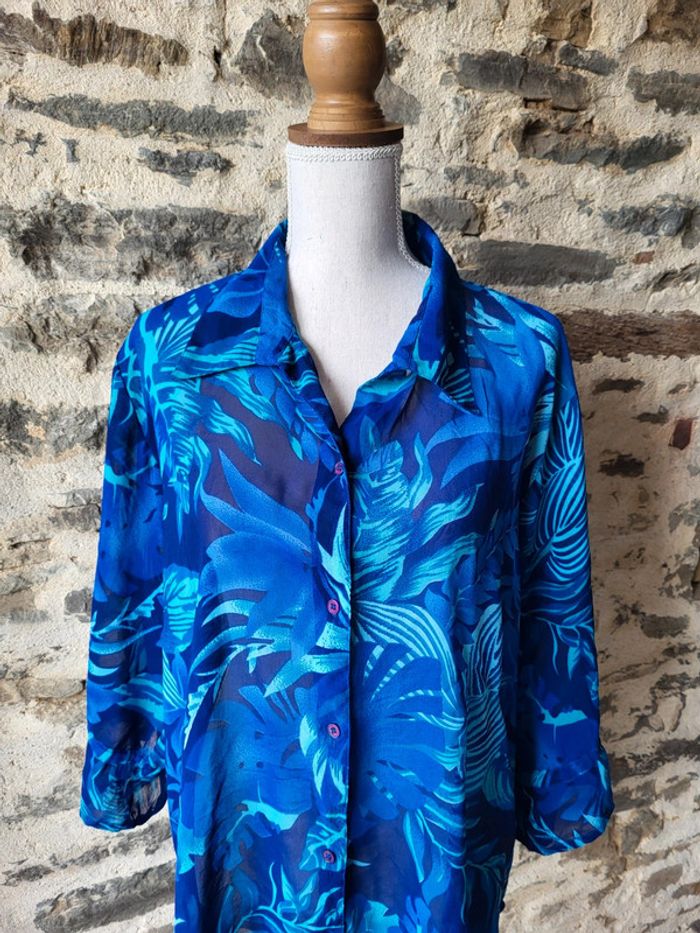 Très jolie chemise légère bleue électrique et turquoise motif feuilles , en voile Blancheporte (étiquette manquante) Taille 46 Très légère fluide et agréable à porter Idéal pour la mi saison ou l'été, ouverte au dessus d'un débardeur ou maillot de bain ☺️ Encore plus belle en vrai avec ses couleurs gaies En excellent état, comme neuf 🌸 N'hésitez pas à faire un lot, j'ai beaucoup de hauts dans mon dressing et autres articles ☺️, je vous ferai un prix final sympa ! Il suffit de cliquer sur le # de la taille recherchée dans mon "Profil" #matka27_taille46 #taille46 #blancheporte #chemise #légère #bleu #électrique #roi #motifs #feuilles #vintage