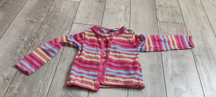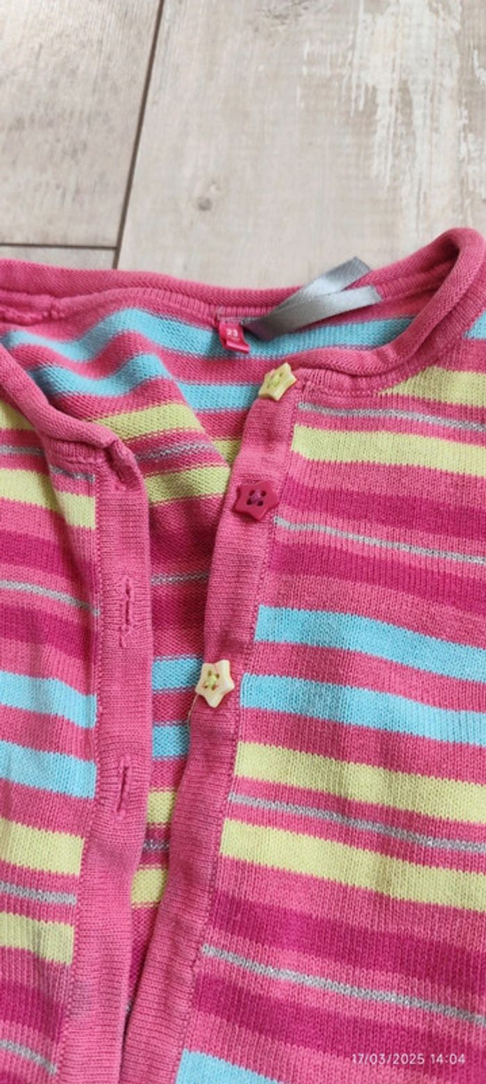 Je vends ce gilet rayé multicolore, avec des boutons en forme d'étoiles de la marque Orchestra et en taille 24 mois. #Estelle2150_enfant_24mois