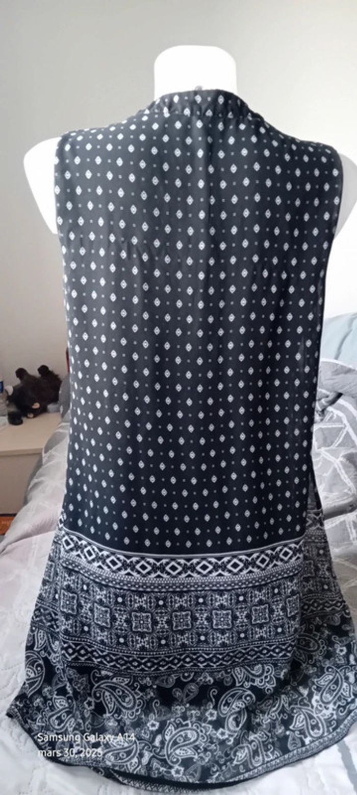 Robe tunique sans manches en polyester matière fluide aspect voile avec doublure col en V motif ethnique noir et blanc passants pour ceinture longueur 87 cm largeur aisselles à aisselles 44 cm peu portée en très bon état #midole #midolefemme #midolefemme40 #robetuniquefemme40 #robeestivale40 #femme40 #athmophere #motifethnique
