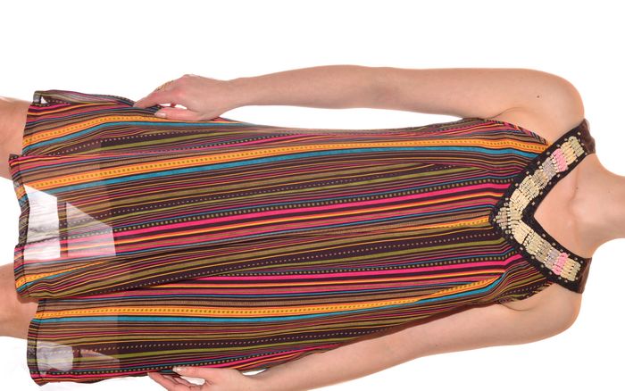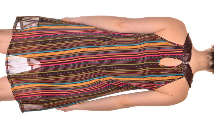 robe ethnique d'été fluide sans manches doublée col V rayée avec ornements dans les tons chaud taille S/M aisselle à aisselle 40,5 cm au niveau de la taille 47 cm hanche 52 cm longueur 89 cm 100% polyester