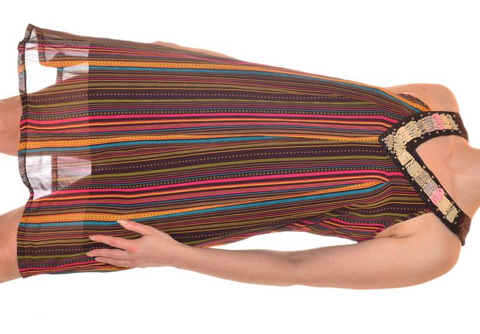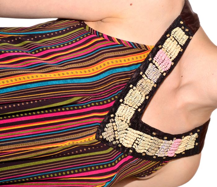 robe ethnique d'été fluide sans manches doublée col V rayée avec ornements T38