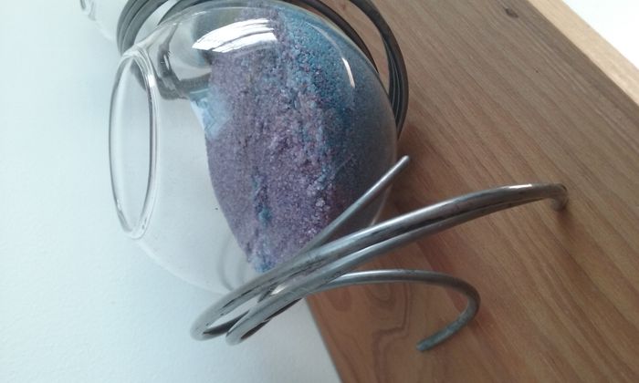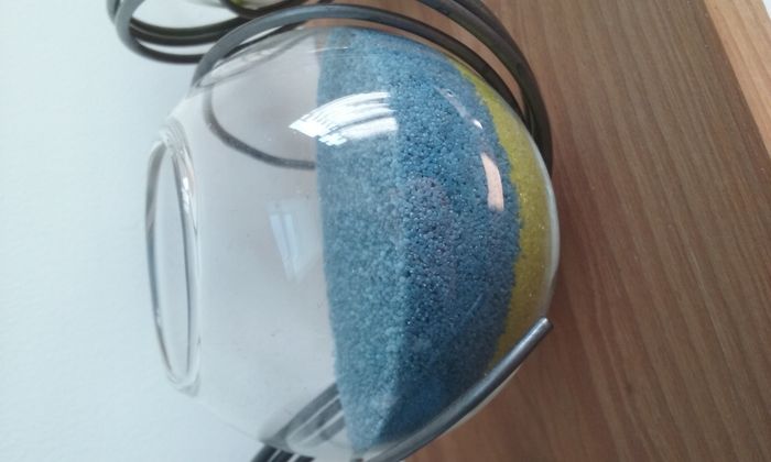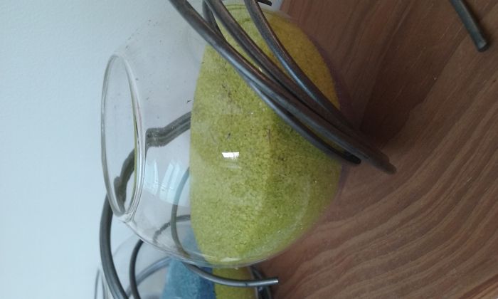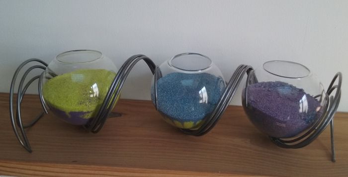 On y a mis du sable mais vous pouvez y mettre par exemple de l'eau colorée avec des fleurs sans tige ou encore de petits cactus... Les déclinaisons sont multiples et en fait donc un nouvel objet à chaque changement de décor! 34 cm