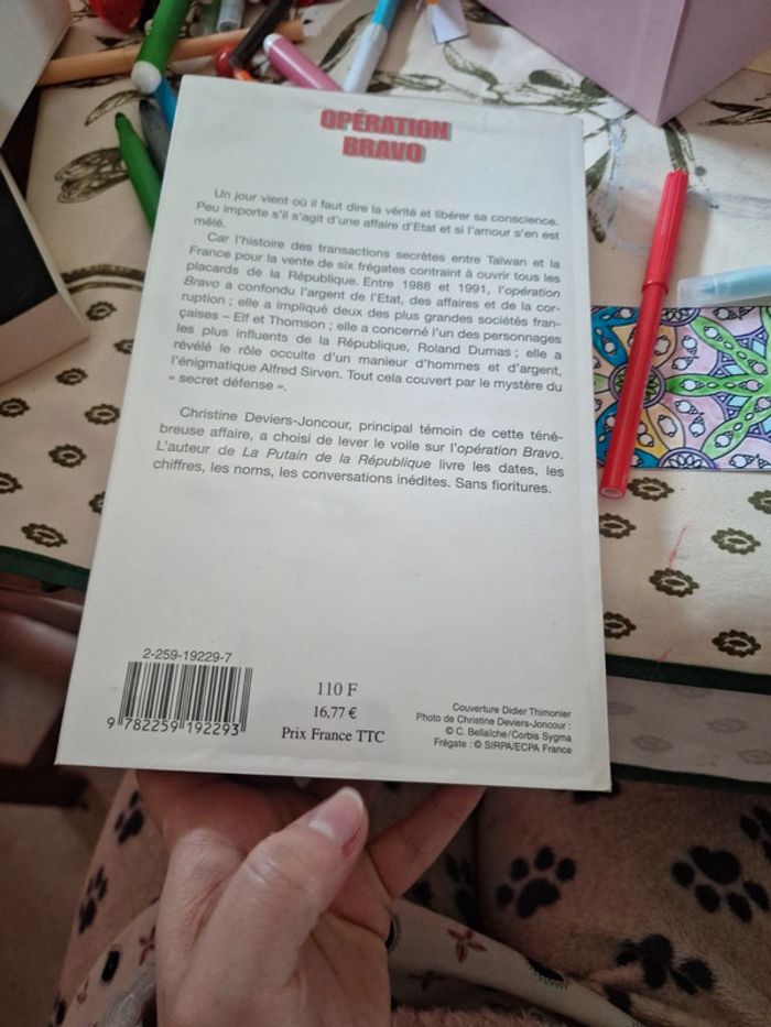 Auteur(s) : Deviers-Joncour Christine Editeur : Plon Parution : 28/01/2000 Nombre de pages : 190 Nombre de livres : 1 Expédition : 305 Dimensions : 22.5 x 14 x 1.8 Résumé : Un jour vient où il faut dire la vérité et libérer sa conscience. Peu importe s'il s'agit d'une affaire d'Etat et si l'amour s'en est mêlé. Car l'histoire des transactions secrètes entre Taïwan et la France pour la vente de six frégates contraint à ouvrir tous les placards de la République. Entre 1988 et 1991, l'opération Bravo a confondu l'argent de l'Etat, des affaires et de la corruption . elle a impliqué deux des plus grandes sociétés françaises - Elf et Thomson . elle a concerné l'un des personnages les plus influents de la République, Roland Dumas . elle a révélé le rôle occulte d'un manieur d'hommes et d'argent, l'énigmatique Alfred Sirven. Tout cela couvert par le mystère du " secret défense ". Christine Deviers-Joncour, principal témoin de cette ténébreuse affaire, a choisi de lever le voile sur l'opération Bravo. L'auteur de La Putain de la République livre les dates, les chiffres, les noms, les conversations inédites. Sans fioritures.