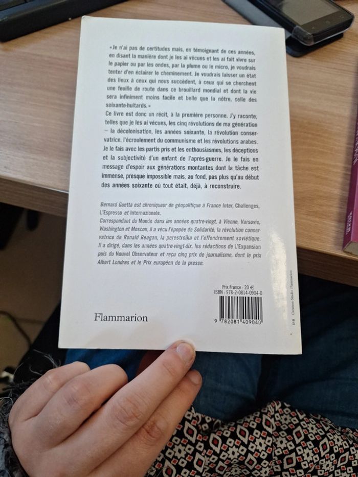Auteur(s) : Guetta Bernard Je n'ai pas de certitudes mais, en témoignant de ces années, en disant la manière dont je les ai vécues et les ai fait vivre sur le papier ou par les ondes, par la plume ou le micro, je voudrais tenter d'en éclairer le cheminement. Je voudrais laisser un état des lieux à ceux qui nous succèdent, à ceux qui se cherchent une feuille de route dans ce brouillard mondial et dont la vie sera infiniment moins facile et belle que la nôtre, celle des soixante-huitards." Ce livre est donc un récit, à la première personne. J'y raconte, telles que je les ai vécues, les cinq révolutions de ma génération - la décolonisation, les années soixante, la révolution conservatrice, l'écroulement du communisme et les révolutions arabes. Je le fais avec les partis pris et les enthousiasmes, les déceptions et la subjectivité d'un enfant de l'après-guerre. Je le fais en message d'espoir aux générations montantes dont la tâche est immense, presque impossible mais, au fond, pas plus qu'au début des années soixante où tout était, déjà, à reconstruire.