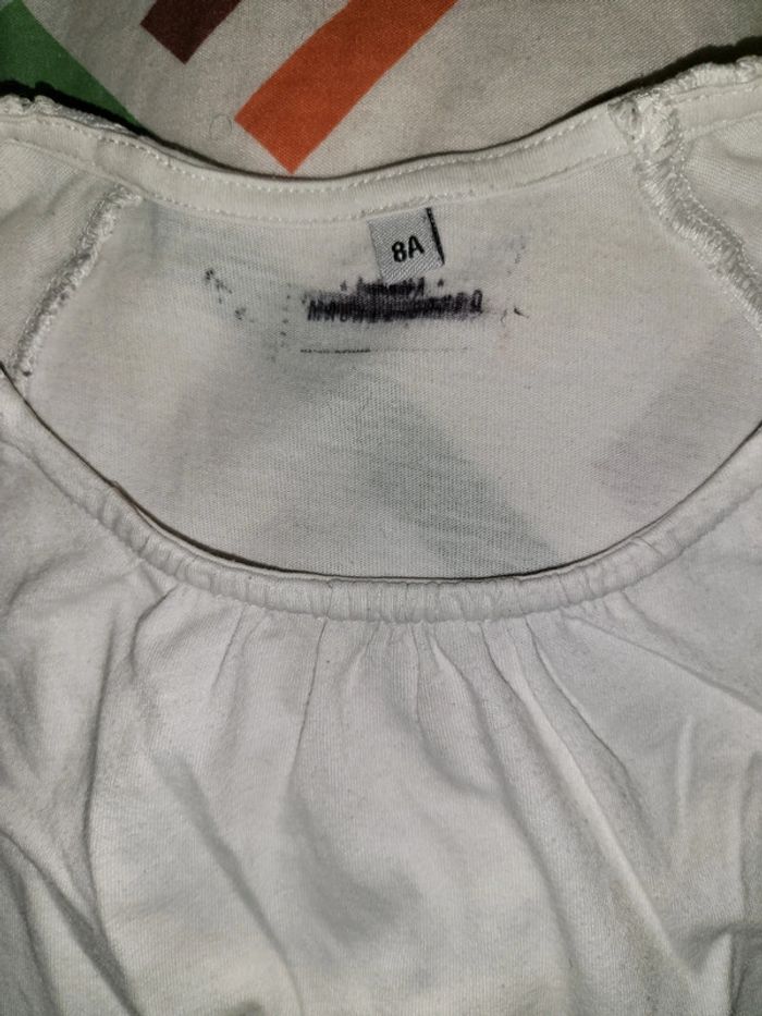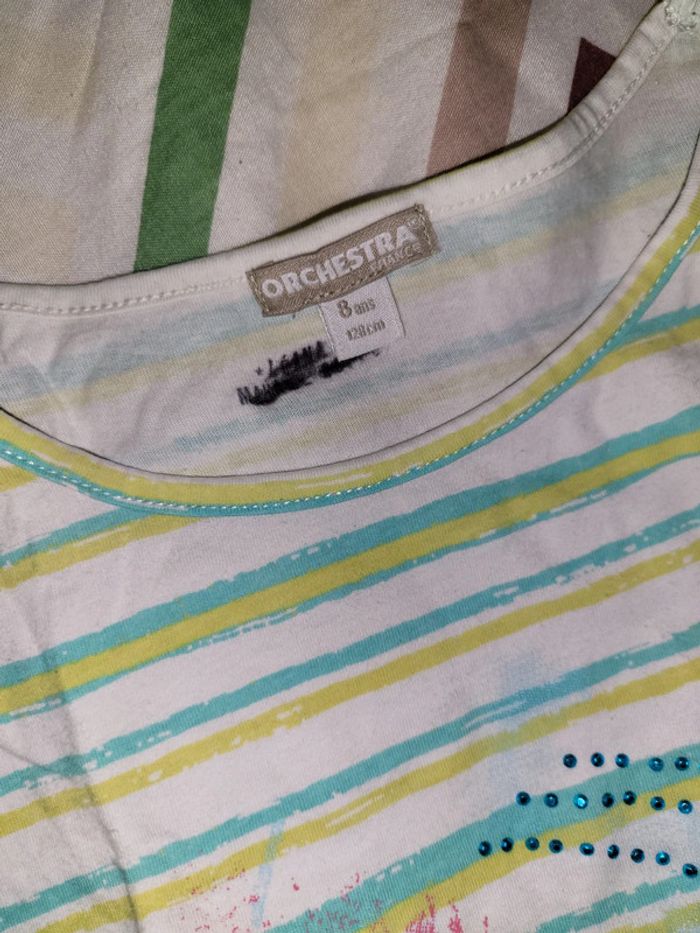Lots de 3 T-shirt manches courtes 8 ans Kiabi / orchestra / sans marque A noter, nom enfant au tampon qui a été rayé sur le blanc et le vert/jaune rayé (cf photos)