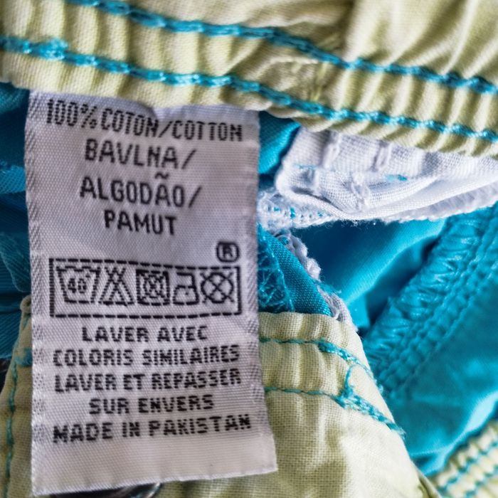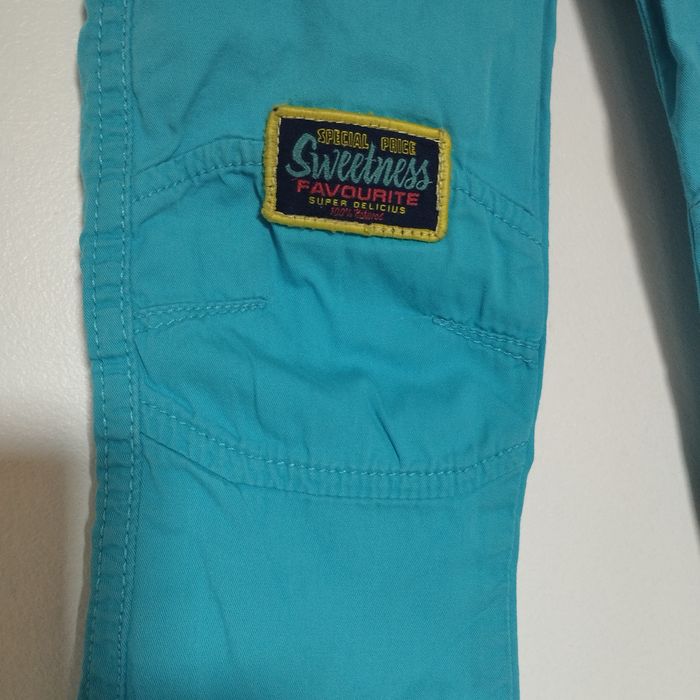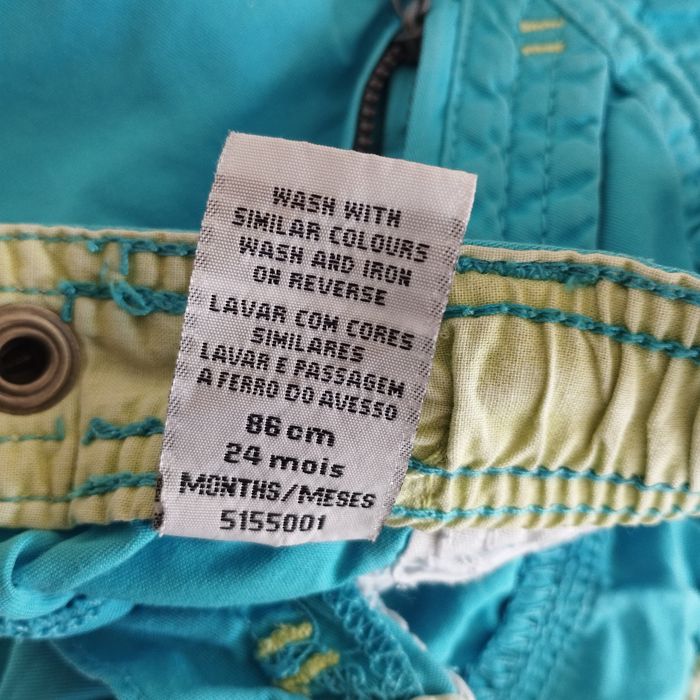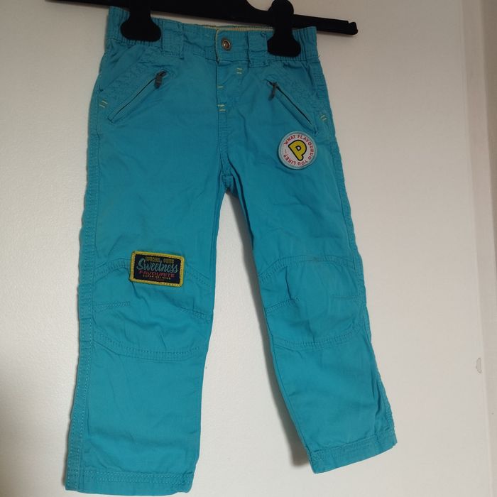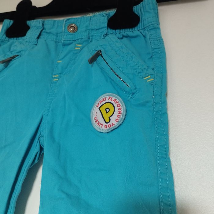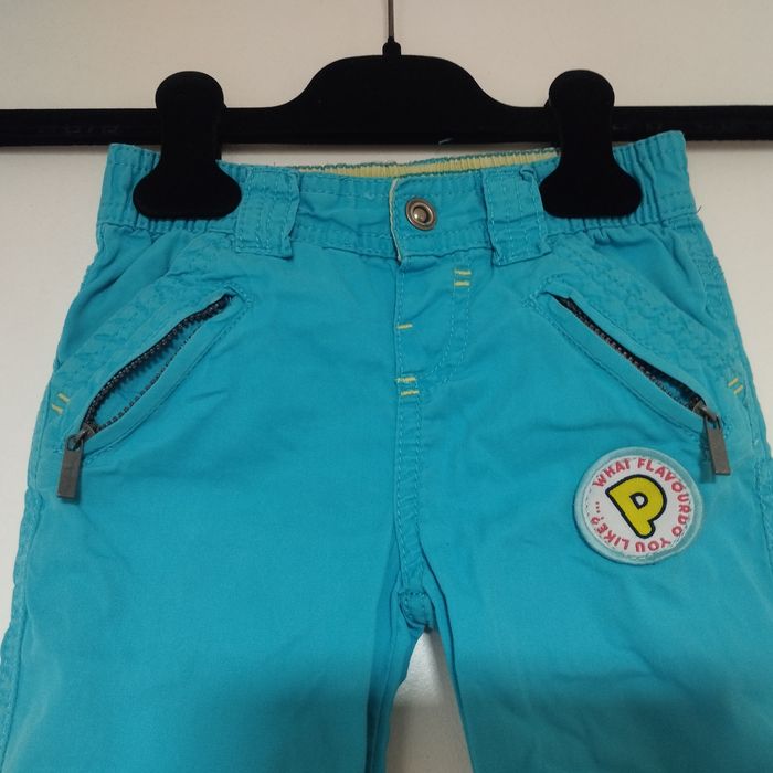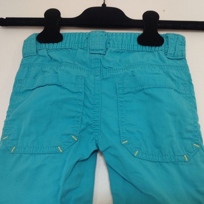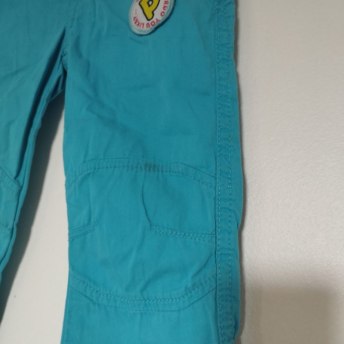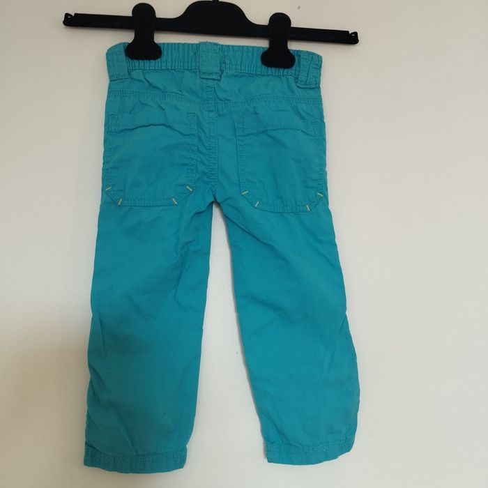 Pantalon pour enfant de 24 mois. Taille élastiquée. Se ferme par un bouton pression. Couleur bleu turquoise.