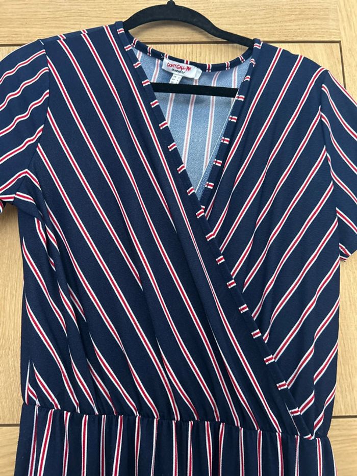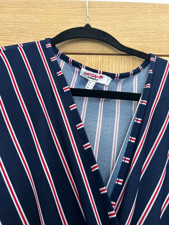 Combinaison taille elastiquee Très peu portée Taille L correspond à un 40 ou 42 Matière élastique Couleur bleu marine à rayures rouge et blanche
