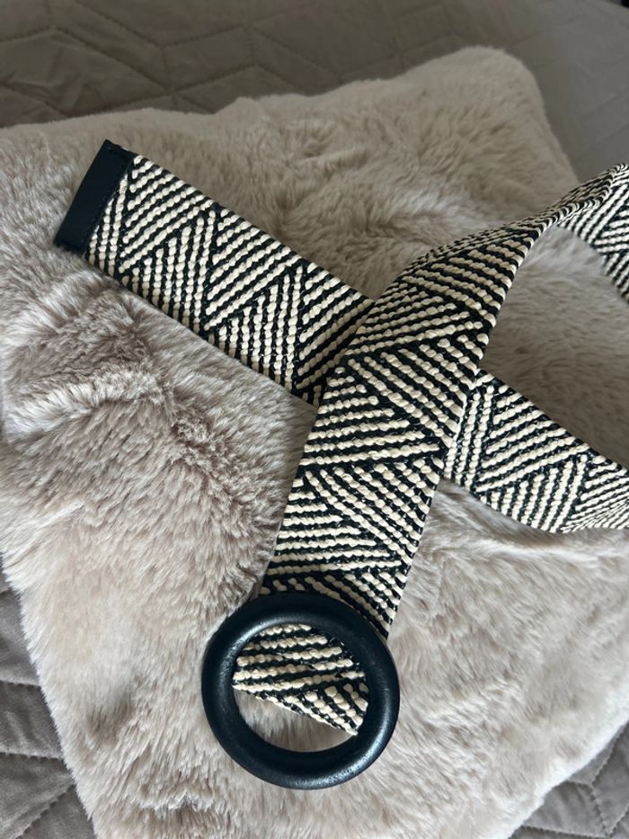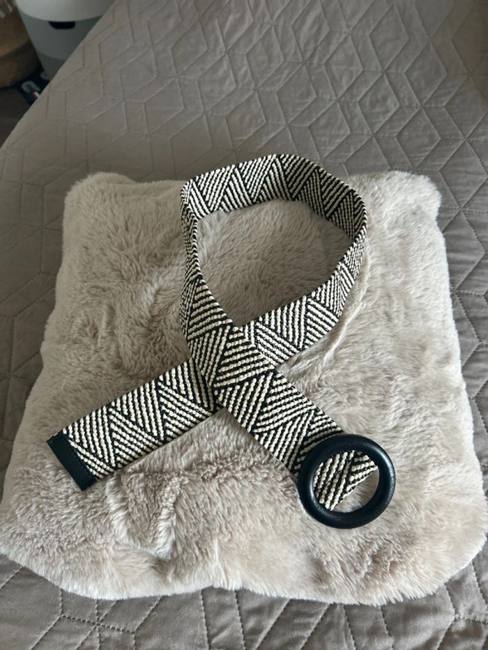 Couleur beige et noire Boucle en bois de couleur noire Élastique Longueur 90 cm sans la boucle Longueur 94 cm avec la boucle En parfait état