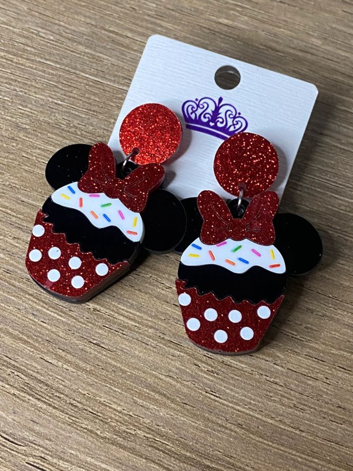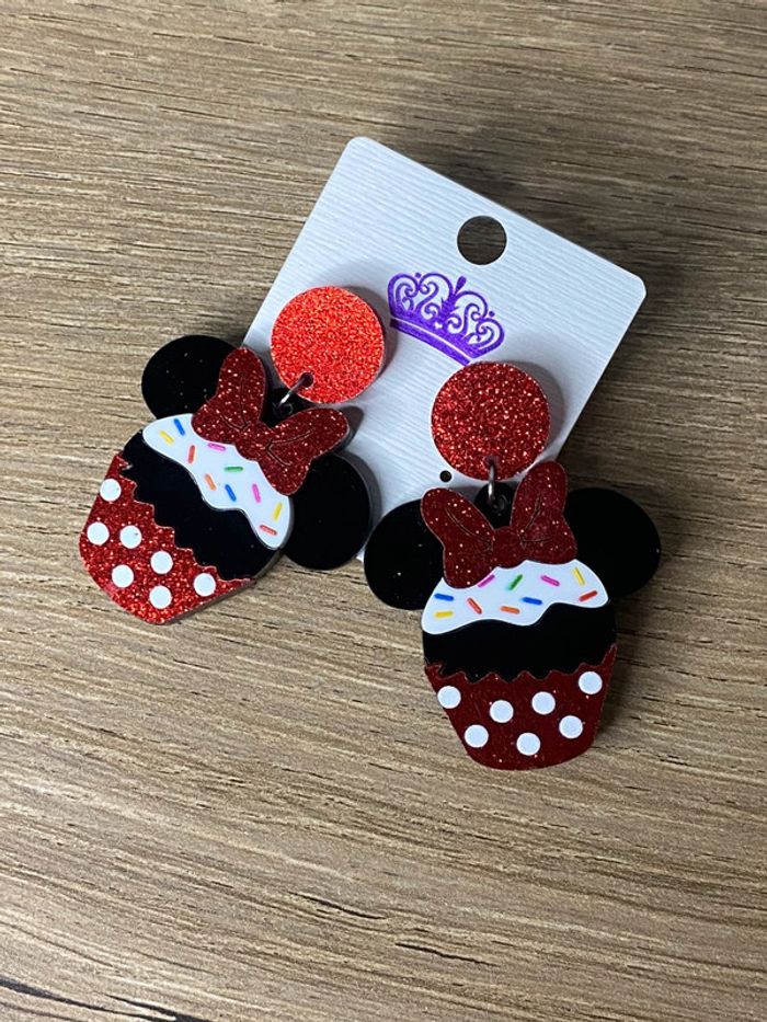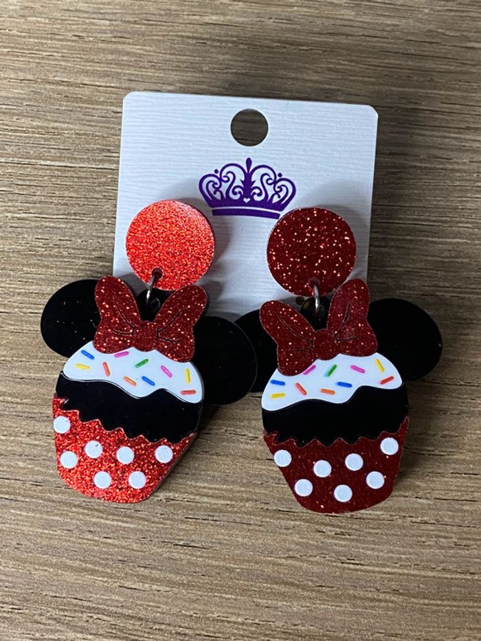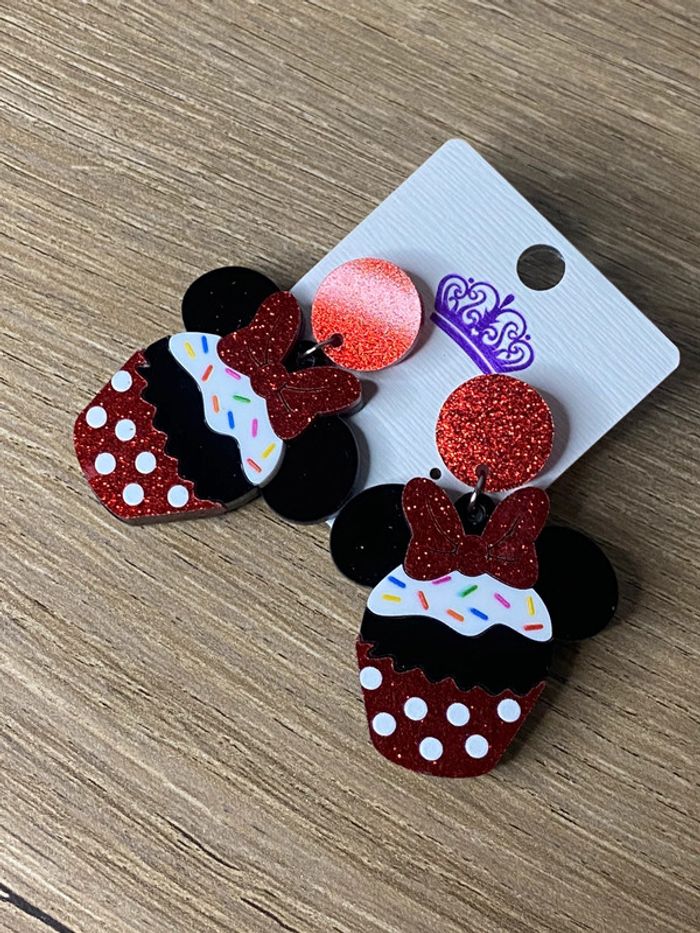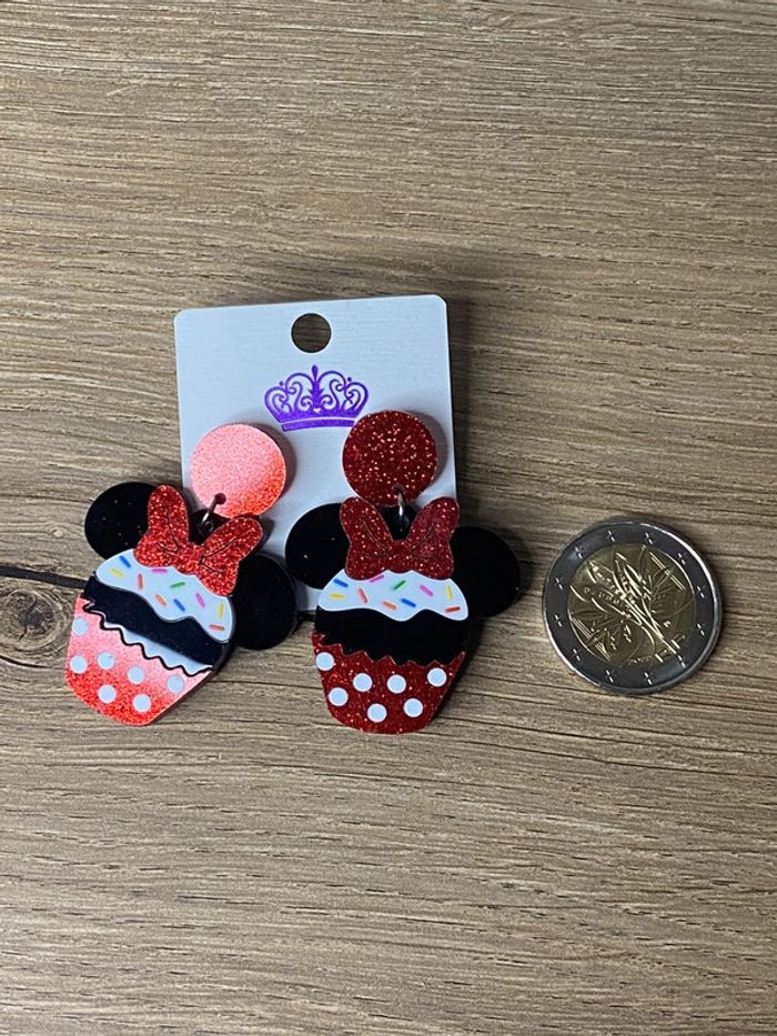 Paire de boucles d’oreille acrylique Minnie cup cake Légère tendance et fun Clou acier inoxydable Vendu dans son petit sac organza idéal pour un cadeau de noël originale Envoi rapide et soigné