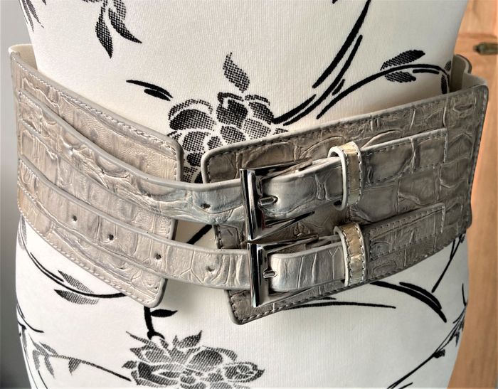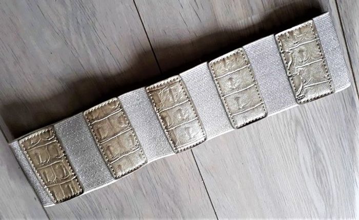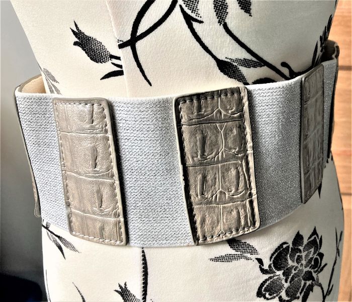 Empiècements simili cuir effet croco verni et bandes élastiquées pailletées, réglable de 72 à 78 cm de tour de taille, largeur 9 cm.