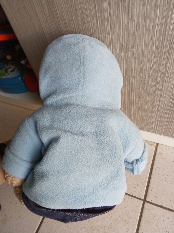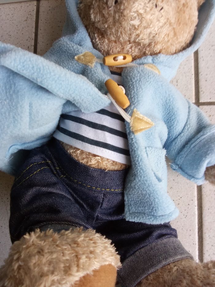 Doudou, peluche  ours beige, bleu, habillé, jean, gilet, rayures - photo numéro 1