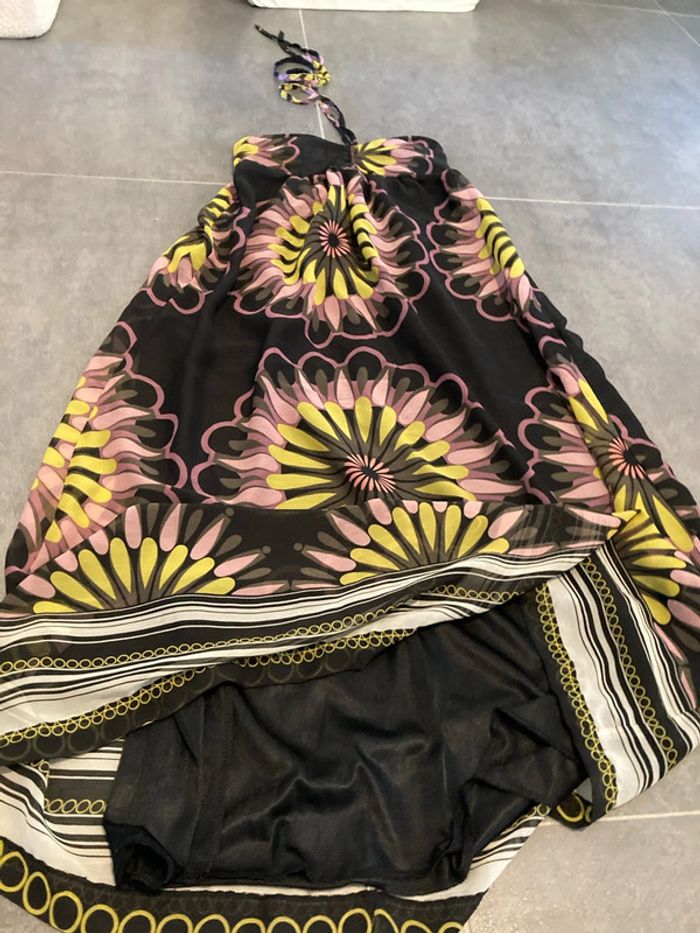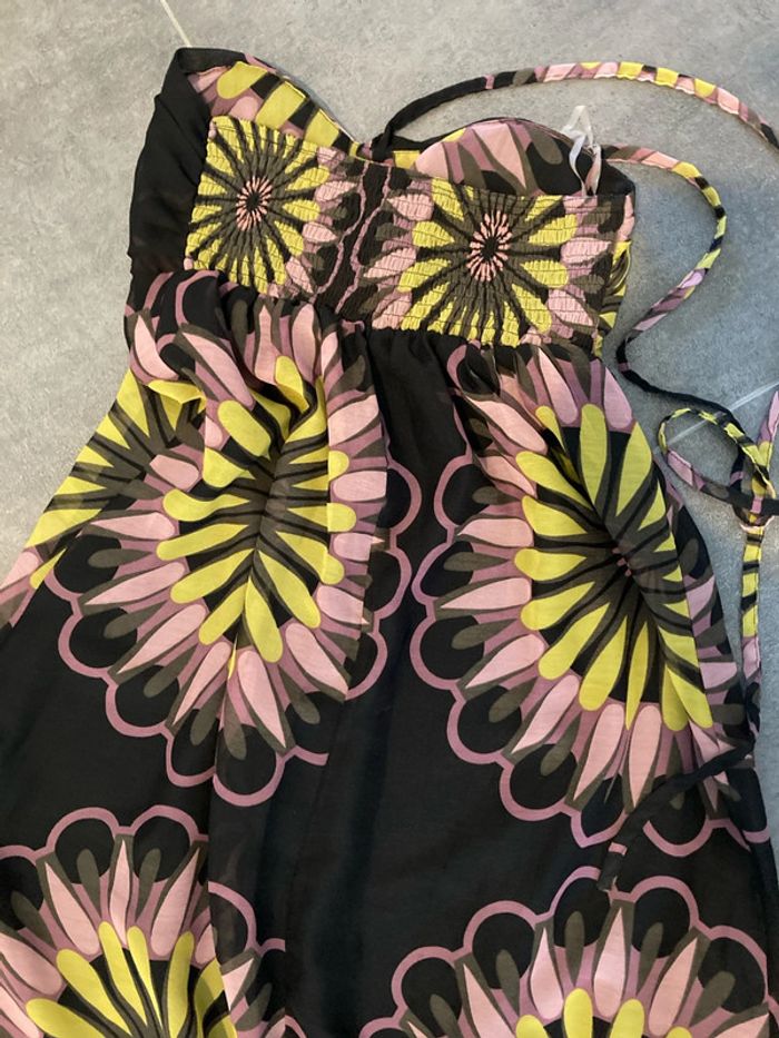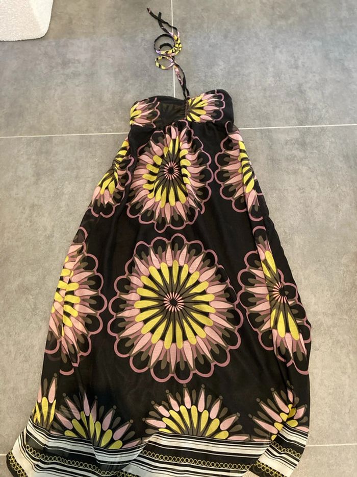 Robe bustier doublée à coques avec cordon pour passer autour du coup. Peu portée, très bon état Froncée à l'arrière au niveau de la poitrine pour ne pas compresser Sans marque, achetée dans une petite boutique en vacances, taille 2