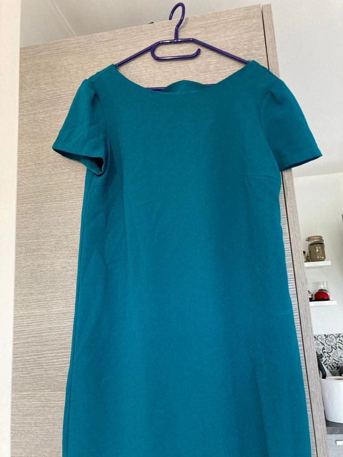Robe bleue avec dos original avec un noeud. Robe droite facile à porter. Etam Taille 38 La couleur est un bleu/vert turquoise.
