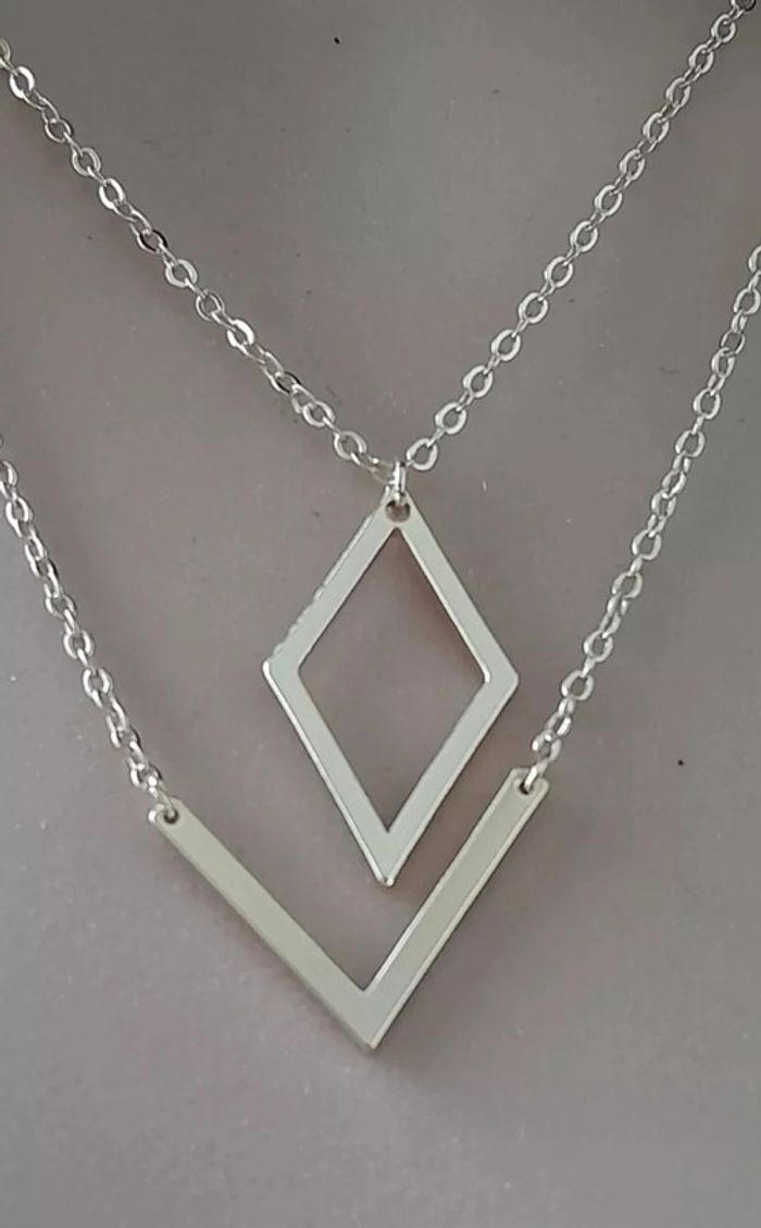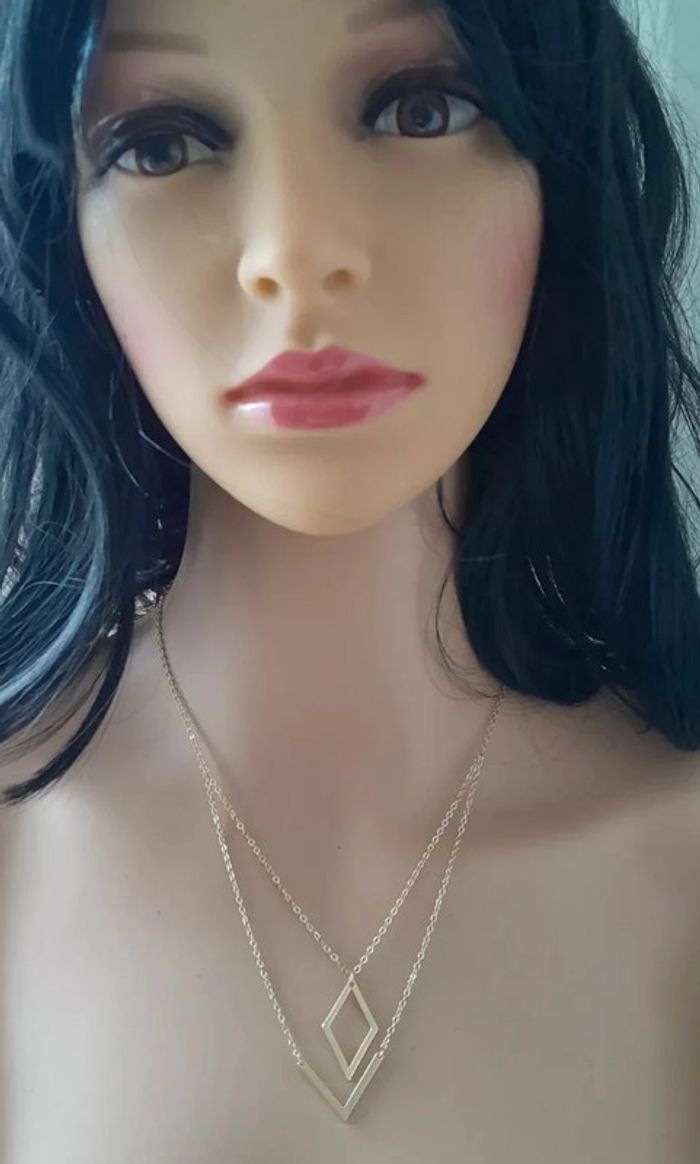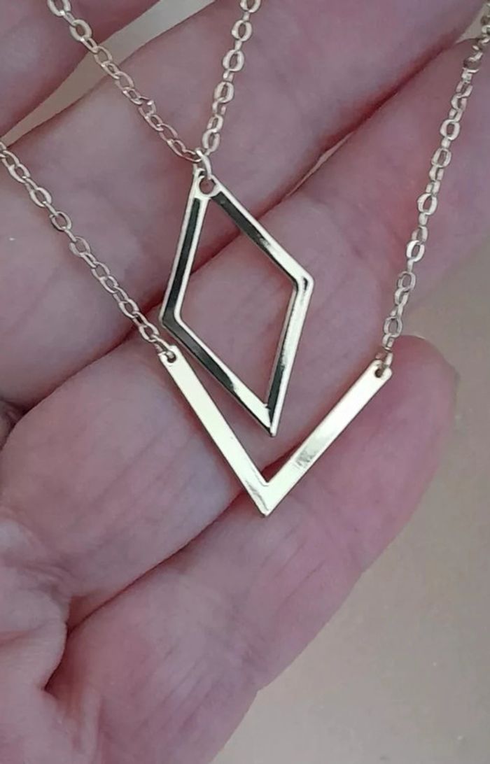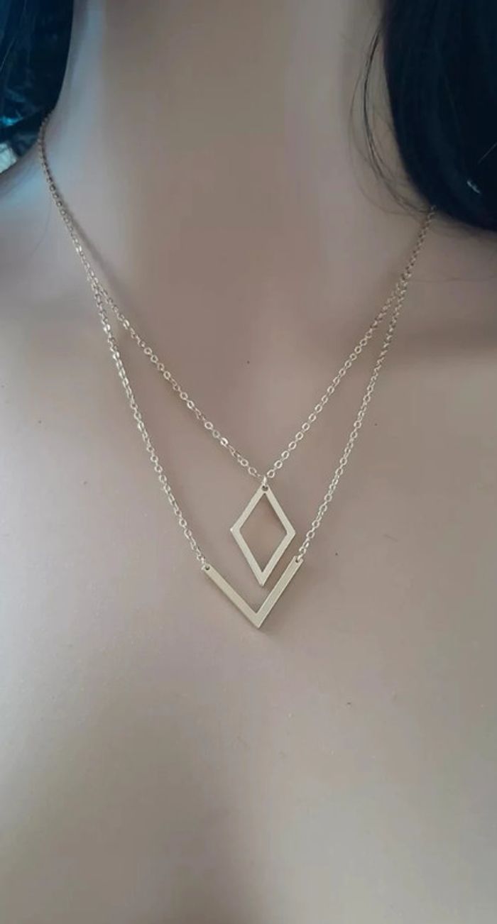 Bonjour, si vous avez aimé cet article, je vous propose d'aller visiter mon dressong ! vous y trouverez peut être un autre article susceptible de vous intéresser. Merci . Bon shopping !!! collier doré, double rangée, 2 pendentifs géométriques, alliage doré