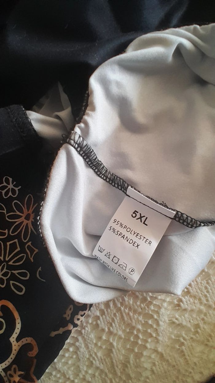 Leggings, imprimé ethnique, noir imprimé, taille 54/56 Taille haute Elastique à la taille 95% Polyester + 5% Spandex QUELQUES MESURES DU VETEMENT POSE A PLAT largeur taille (sans étirer): 52cm hauteur totale : 98cm hauteur à partir de l'entrejambe : 70cm largeur cuisses : 35cm