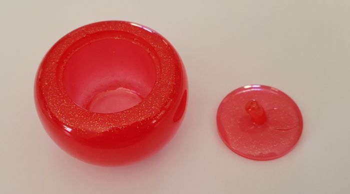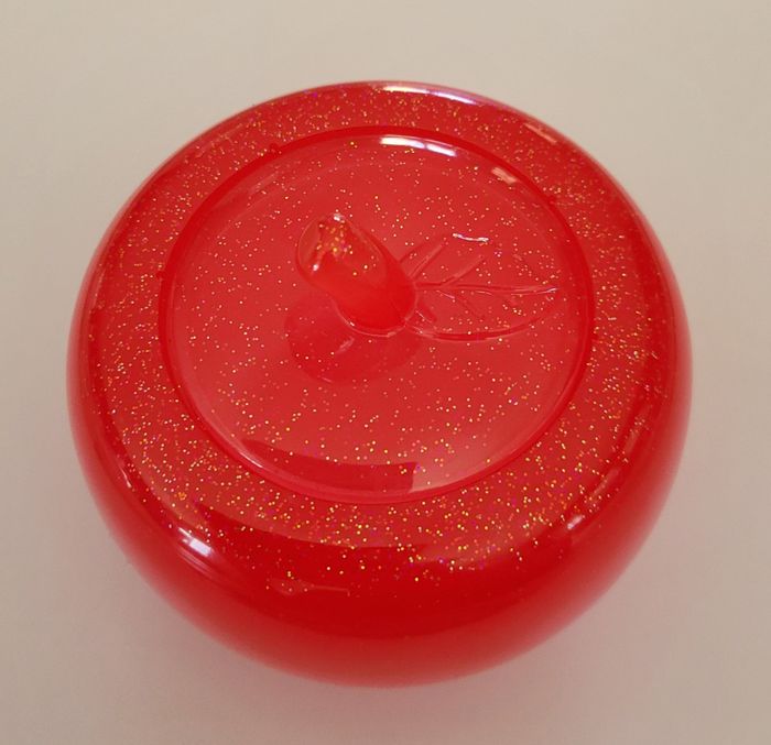 Decoration motif pomme coloris rouge ( toute pailletée). Le couvercle s'enleve et la pomme peut servir de rangement pour de petits objets ( bijoux, pieces ...) Dimensions : 8 x 7,5 cms. Envoi rapide et soigné.