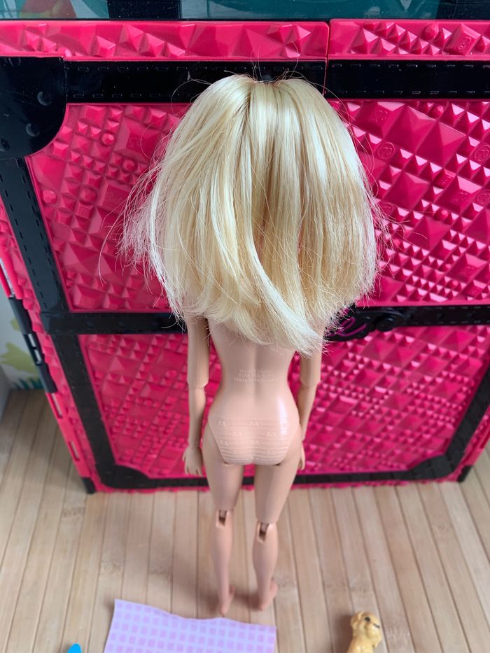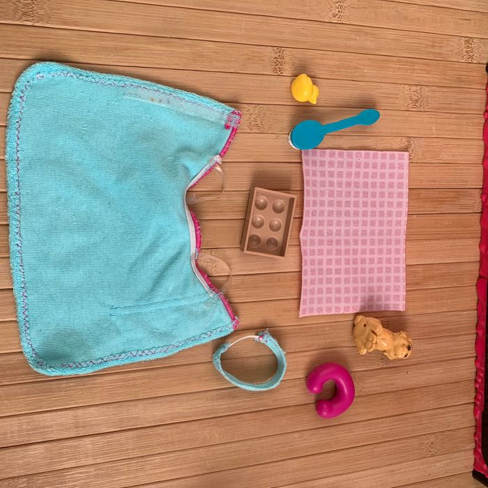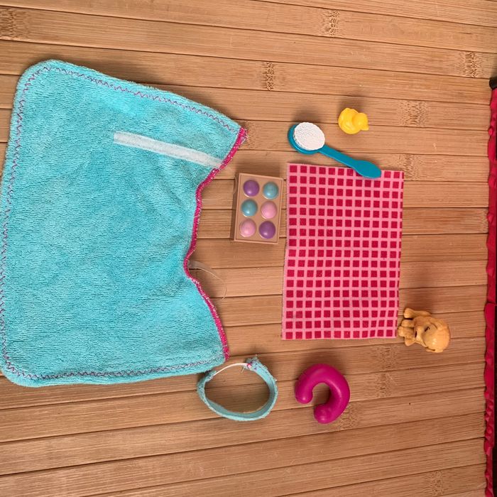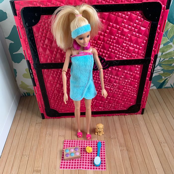 ​Barbie porte une robe en éponge à la fois chic et confortable, une serviette sur la tête assortie et des chaussons de spa roses. ​Elle a aussi 11 points d’articulation au niveau du cou, des épaules, des coudes, des poignets, des hanches et des genoux, pour des poses et des mouvements réalistes. des accessoires de bain tels qu’un canard en caoutchouc, un magazine, une brosse de bain, une serviette, un coffret de boules de bain,un chiot ,un coussin de nuque. État proche du neuf
