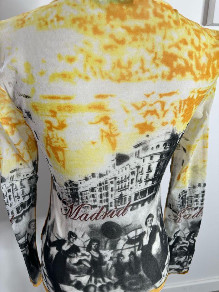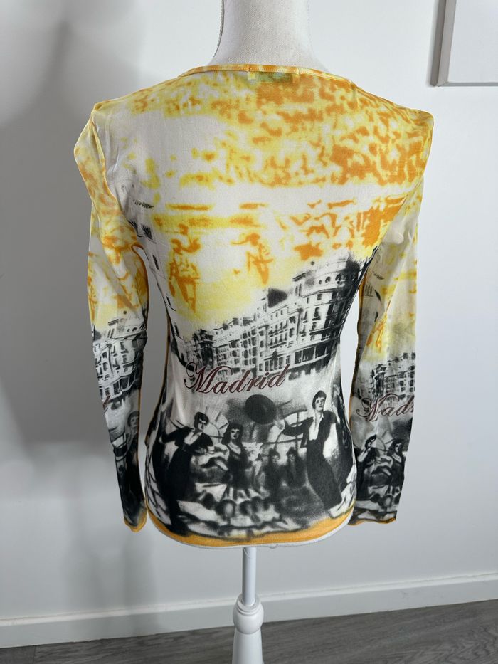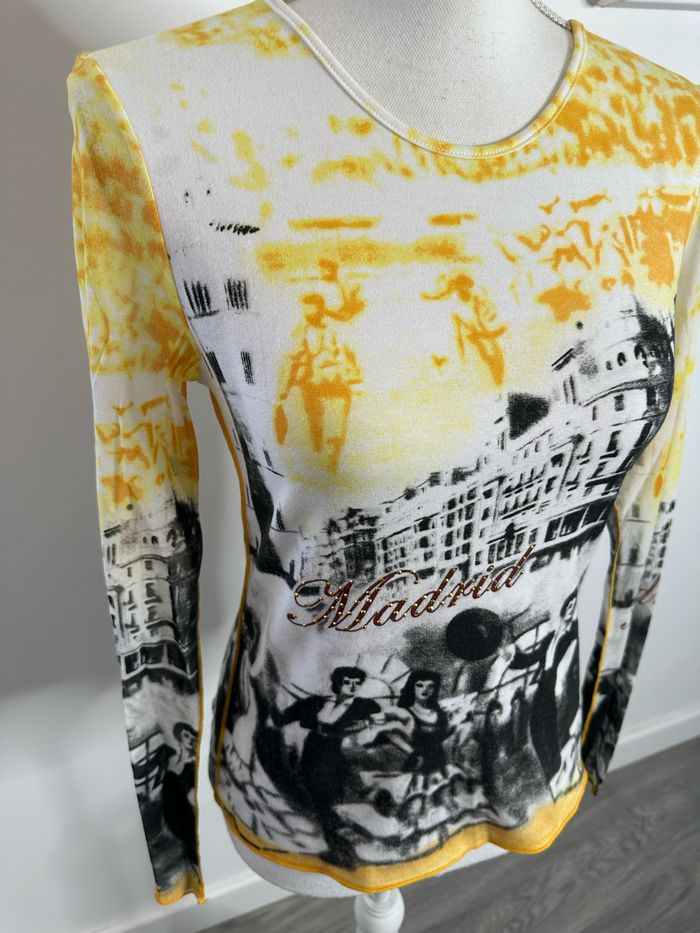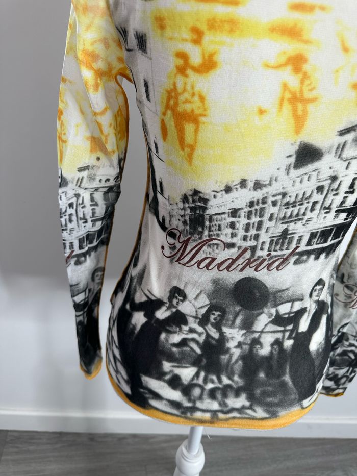 Top - Excellent état - Taille 38 équivalent M - Jaune et gris - Manches en mesh - Buste en coton - Style Y2K, années 2000’ - Imprimés Madrid, strass à l’avant - Coton et spandex Dimensions: - 40 à 48cm niveau aisselles - 57cm de long