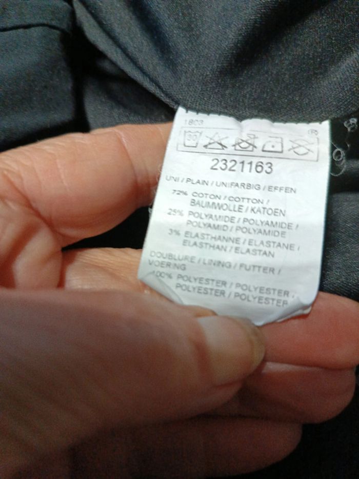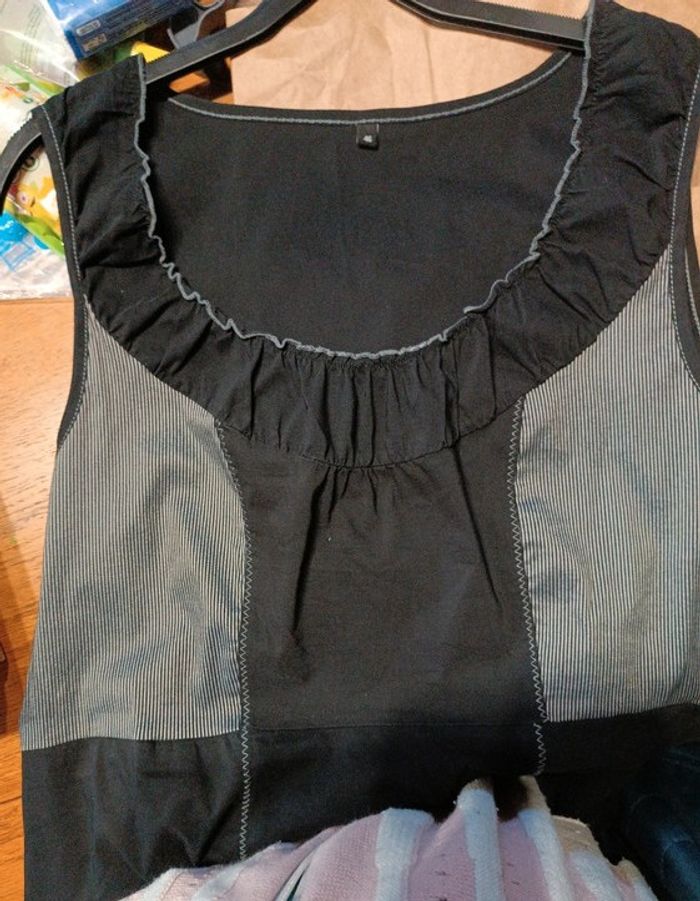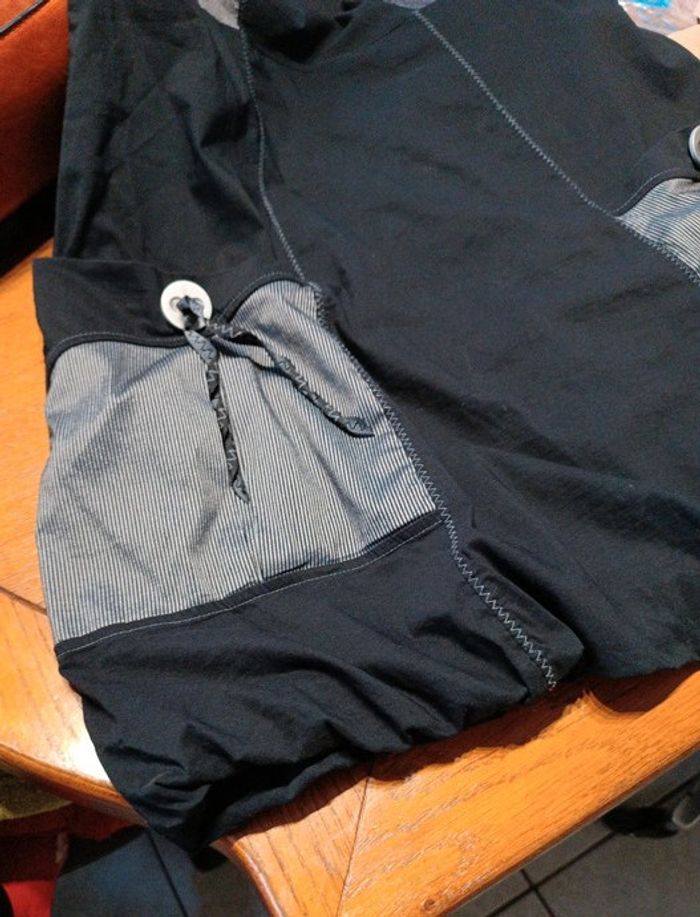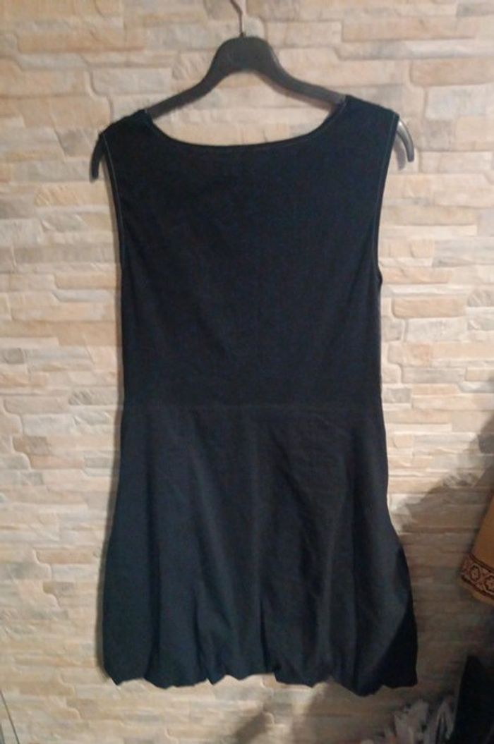Robe noire sans marque, taille 46. Épaules 40 cm. Aisselles 50 cm. Longueur 90 cm. Base retournée élastique. 2 grandes poches. Doublée. 72% coton, 25% polyamide, 3% élasthanne. Doublure 100% polyester. Neuve