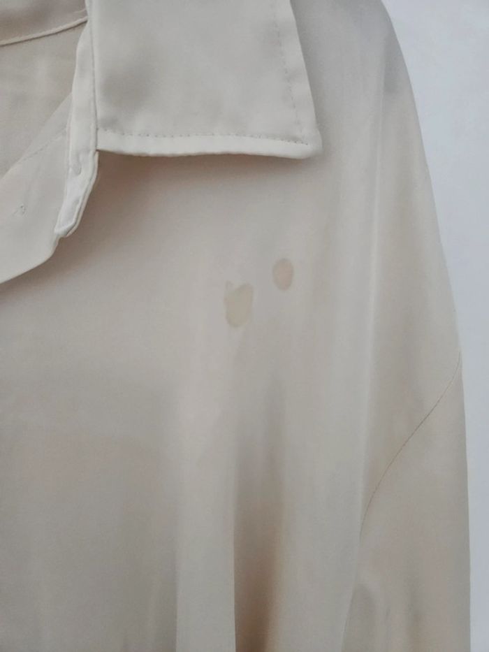 Chemisier en satin en très bon état mais petites tâches qui ne partent pas au lavage. Taille XL (mais taille plus large)