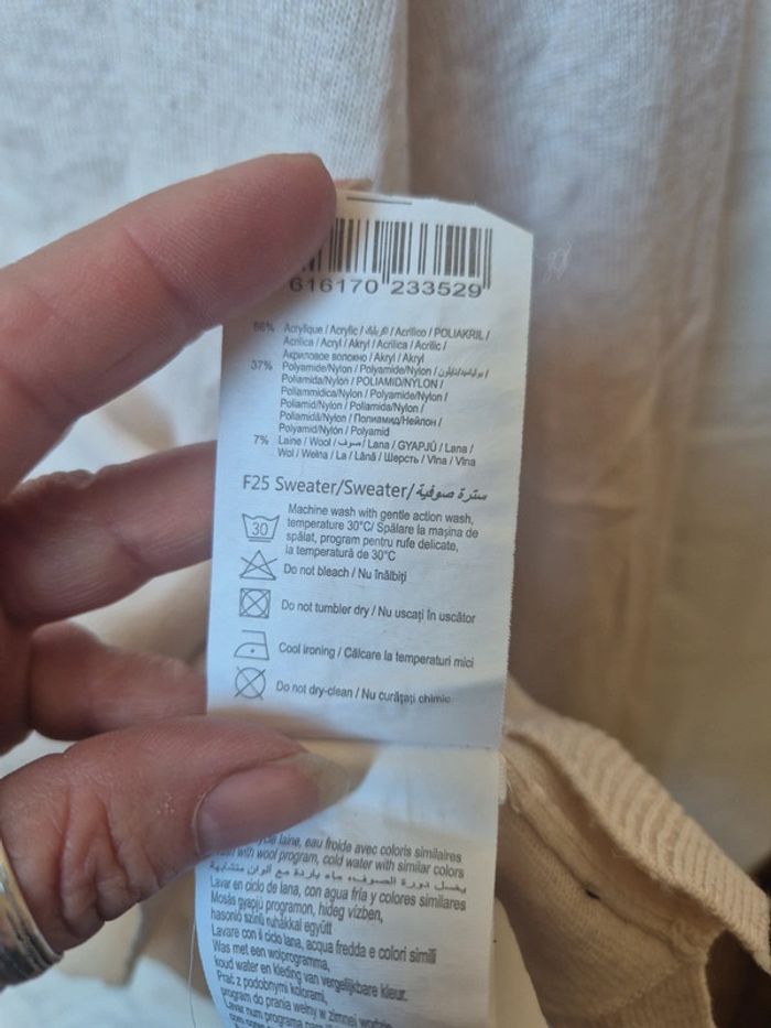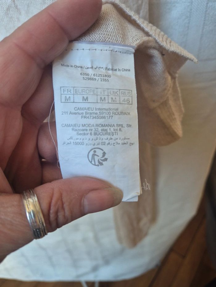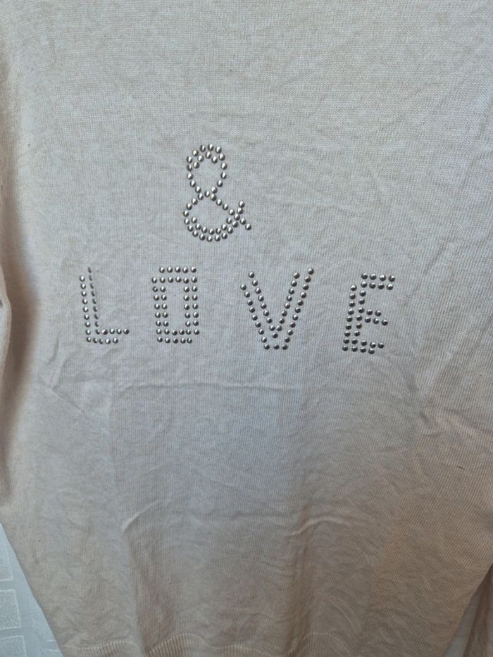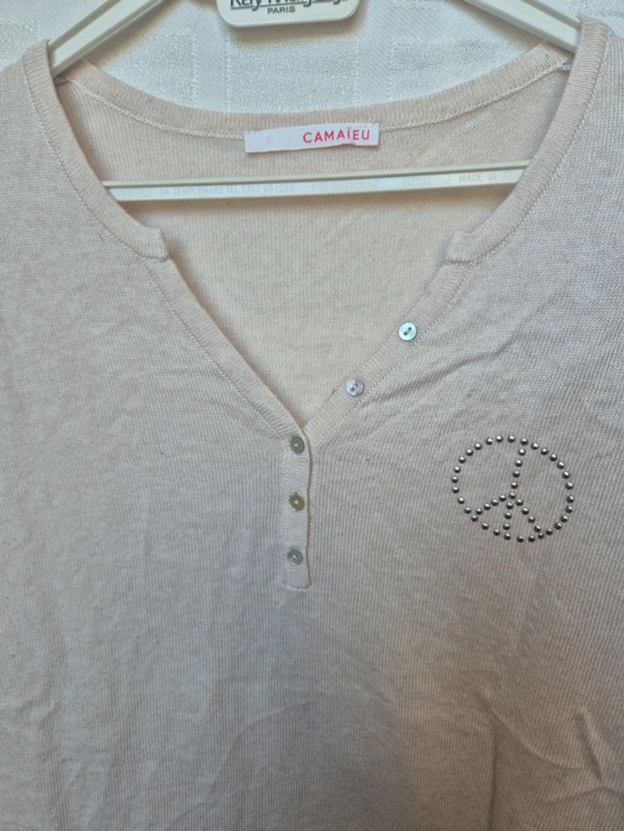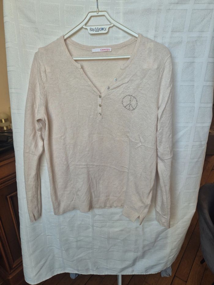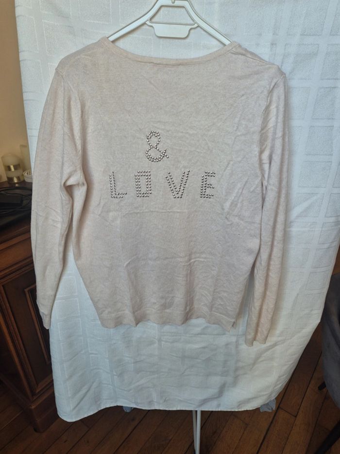 ⬇️mes autres annonces pour femme en taille 38 👉 #cg89femme38 😁 réductions activées des 2 articles ! un pull beige avec strass - logo peace et inscription love au dos. il mesure 42 cm aux épaules, 51 cm aux aisselles et 62 cm de longueur. bon état - taille 38 - marque camaieu #camaieu #pull #peaceandlove #peace #taille38 #strass #femme #colv