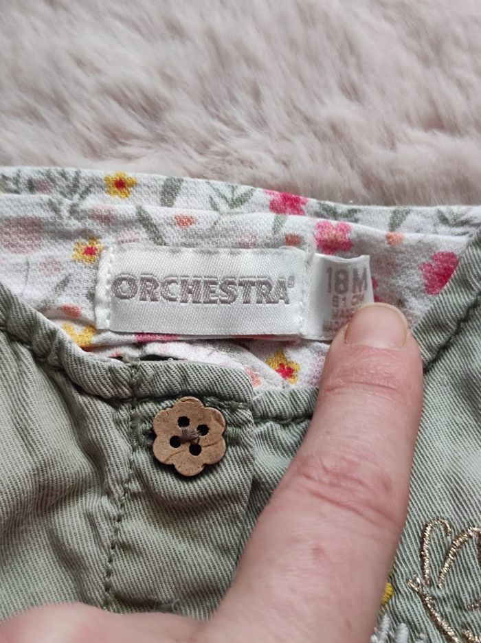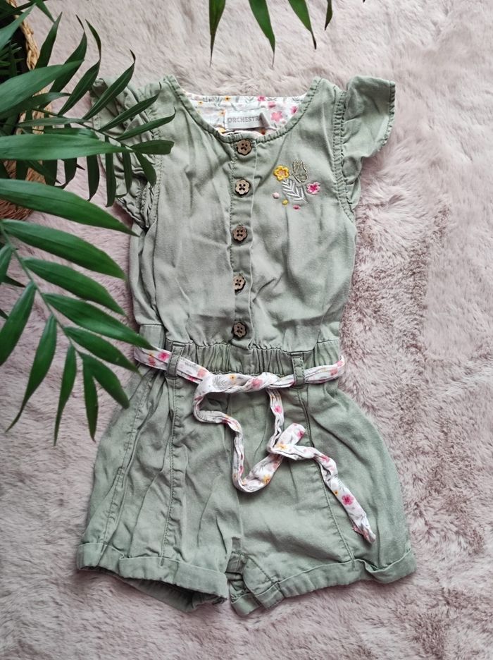 superbe combi-short de couleur kaki clair avec petit ruban de tissu qui fait office de ceinture à la taille qui es élastique. Petites poches de côté , ouverte poitrine a boutons en forme de fleur et manches très courtes à volants. Marque orchestra en 18mois