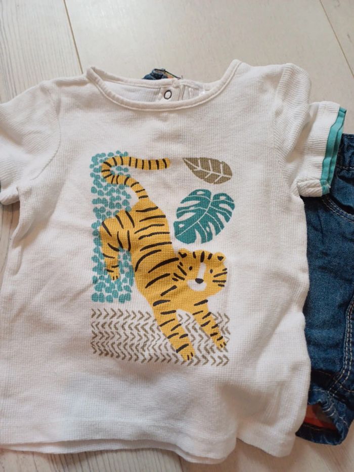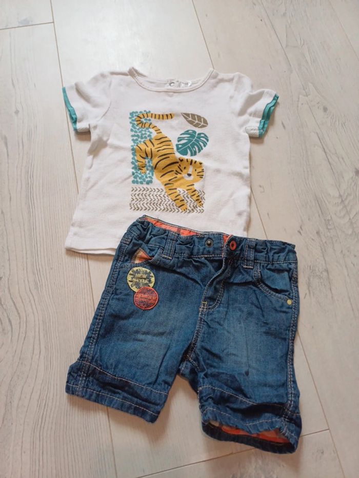 Short en jean bleu Obaïbi 12 mois T-shirt blanc motif lion 🦁 12 mois Orchestra Très bon état #12mois #12moisgarçon #12moislexou_77 #orchestra12moisgarcon #obaibi12moisgarcon