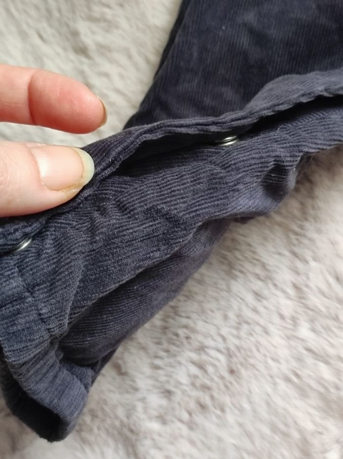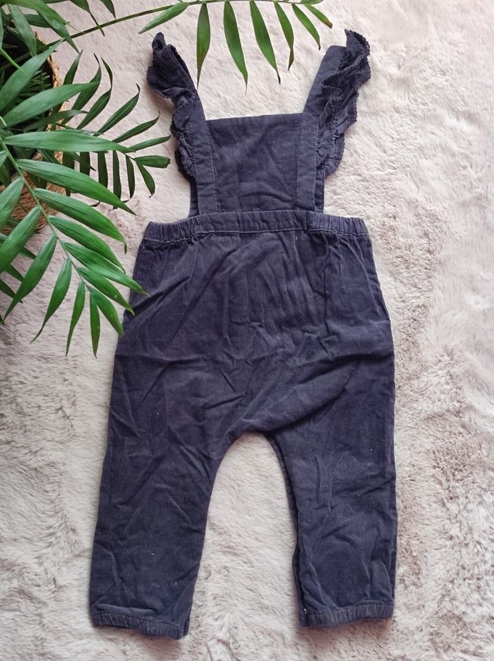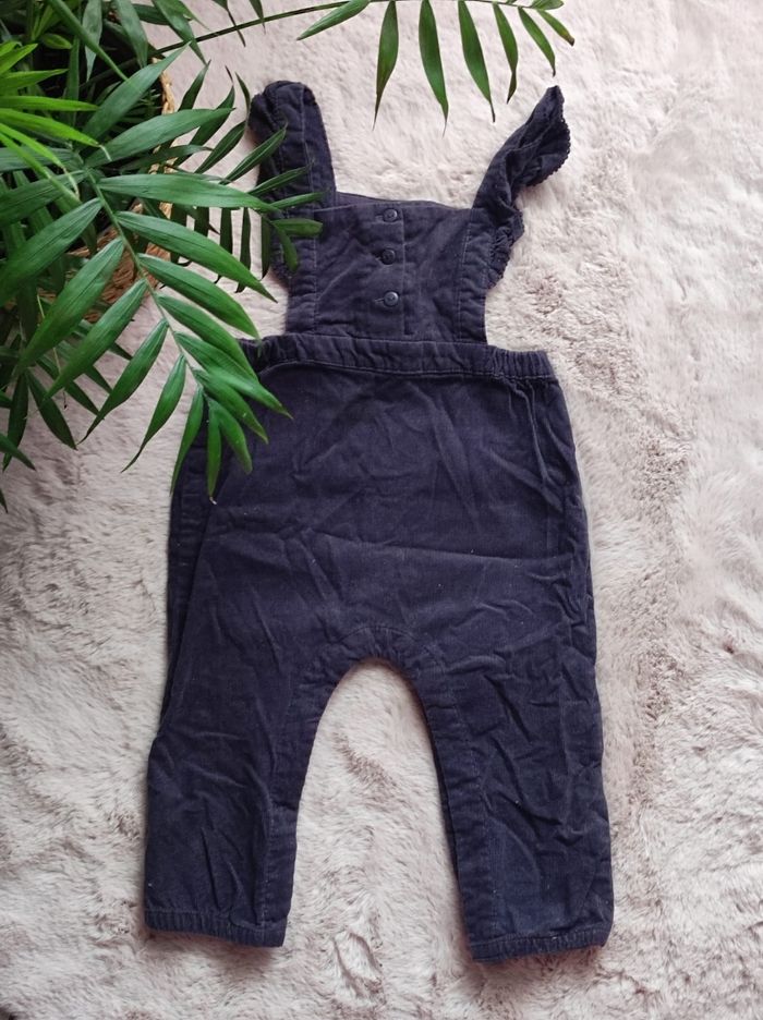 jolie salopette en velour côtelé de couleur bleu marine / foncé. Boutons à pression à l'entre jambes ( pour faciliter l'accès à la couche ). Élastique à la taille sur le côté. Marque kiabi en 18mois
