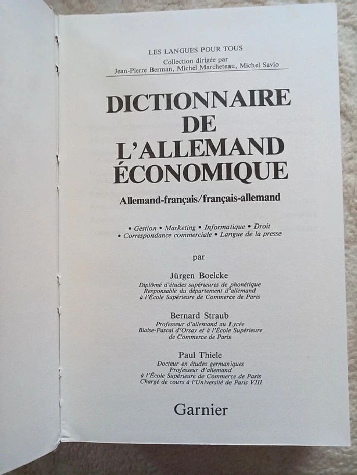 Garnier Dictionnaire de l'allemand économique Allemand-Français Français-Allemand Correspondance commerciale Marketing Informatique Langue de la presse Gestion En très bon état (juste couverture un peu défraîchie et nom inscrit en haut de la première page)