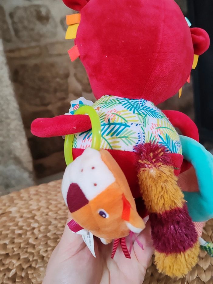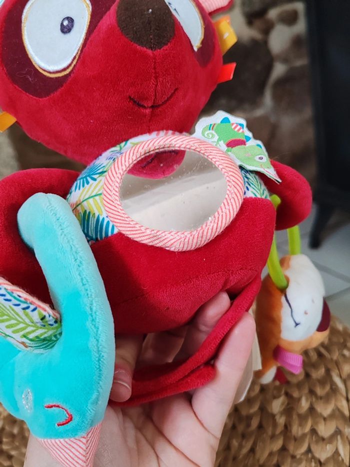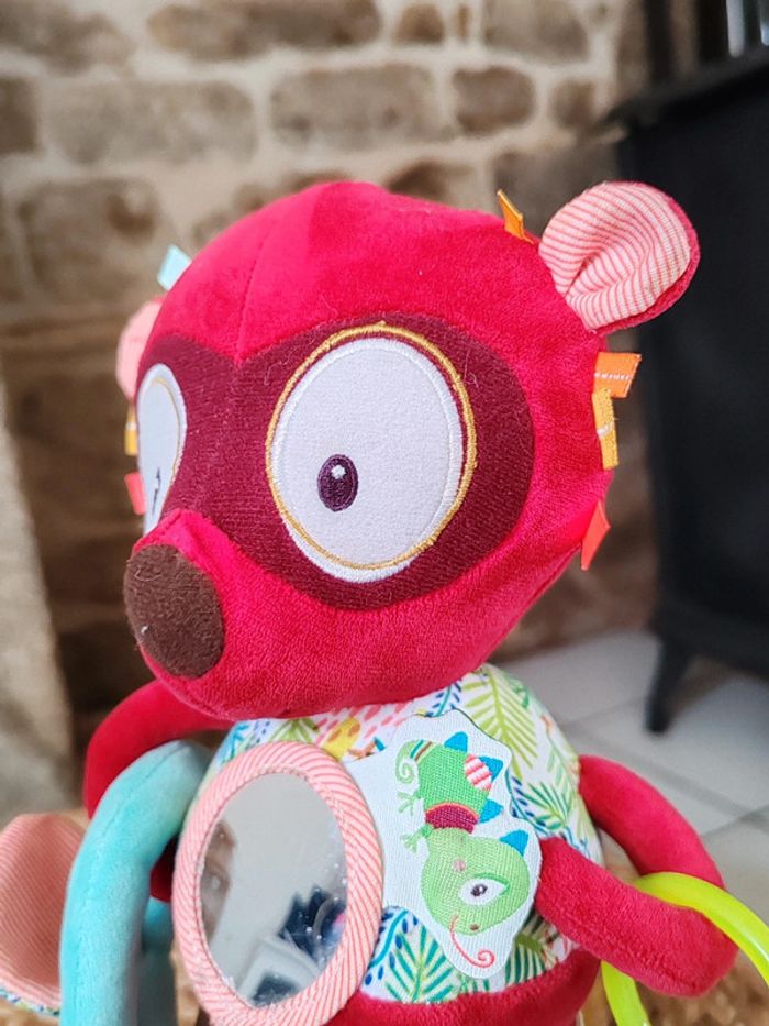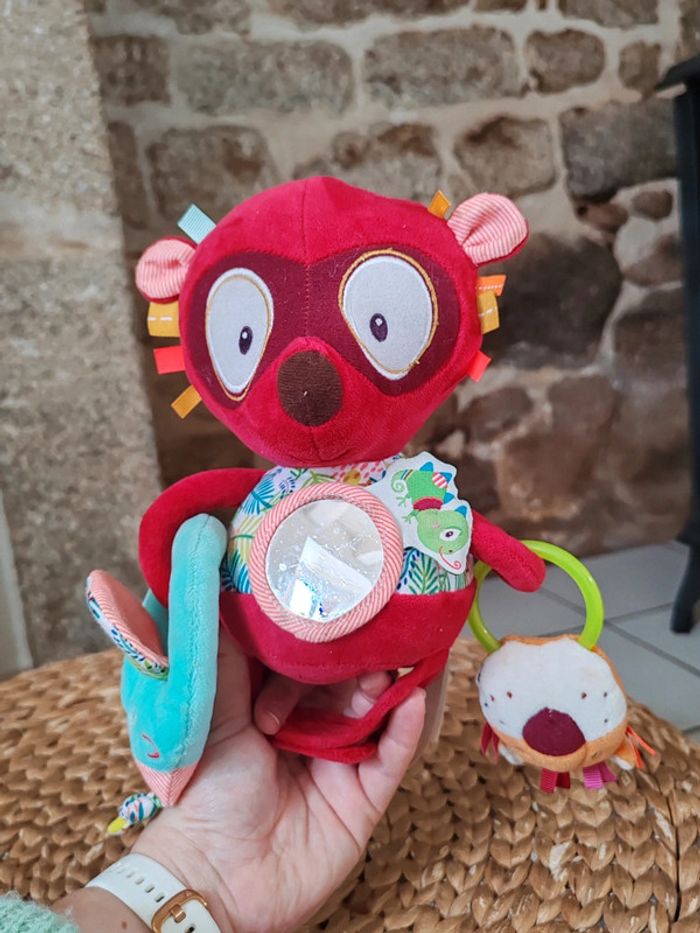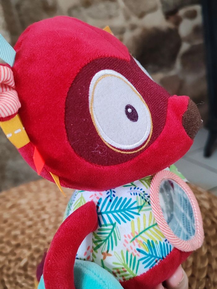 Peluche d'éveil Georges le lémurien Liliputiens Rouge et multicolores Très bon état Peluche sensorielle avec miroir et diverses textures et hochet ➡️ #ursullabuffaypeluches #ursullabuffaybébé