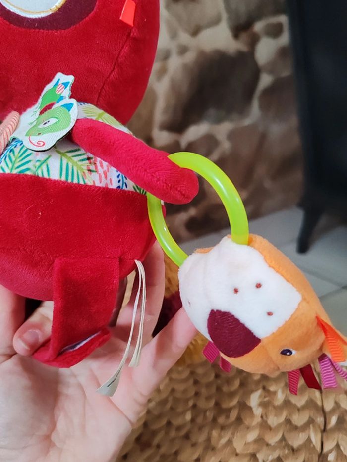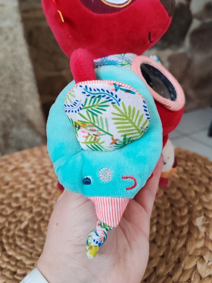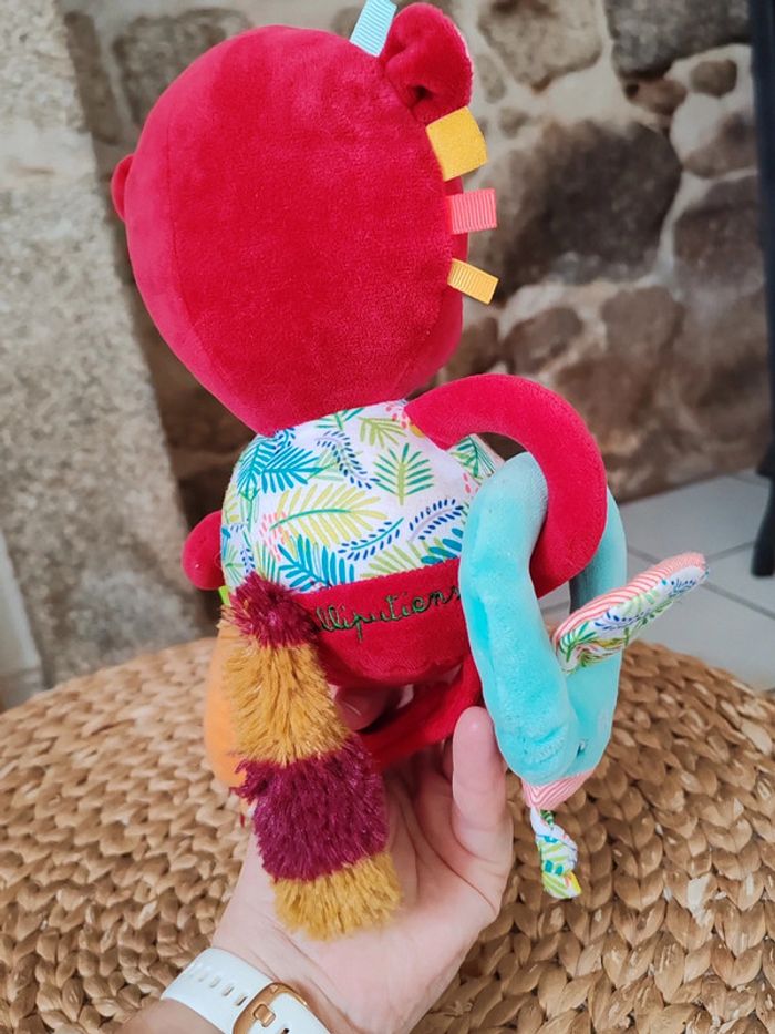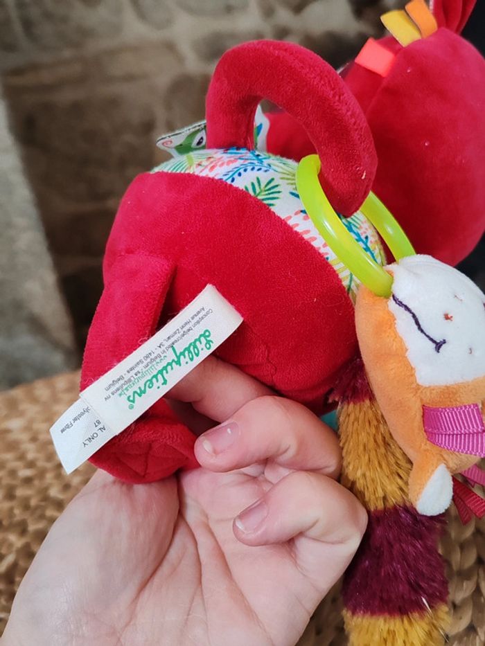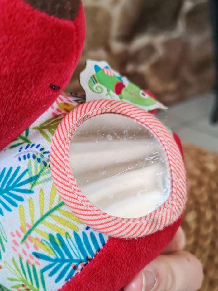Peluche d'éveil Georges le lémurien Liliputiens Rouge et multicolores Très bon état Peluche sensorielle avec miroir et diverses textures et hochet ➡️ #ursullabuffaypeluches #ursullabuffaybébé