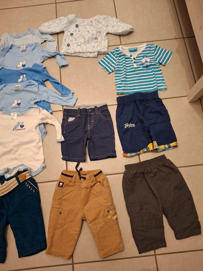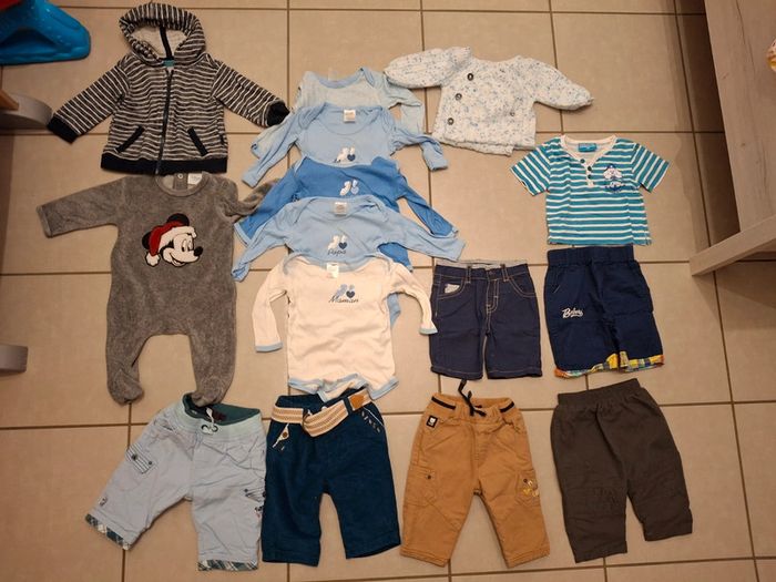 2 vestes /gilets 1 pyjama disney 5 bodies j’aime papa/maman 4 pantalons (dont 3 sergent major) 2 shorts 1 tshirt Le lot pour 10€