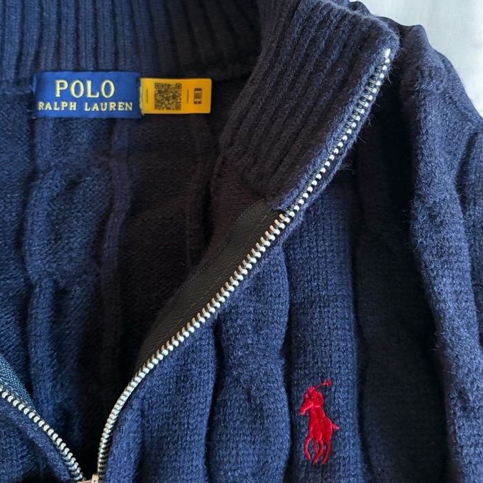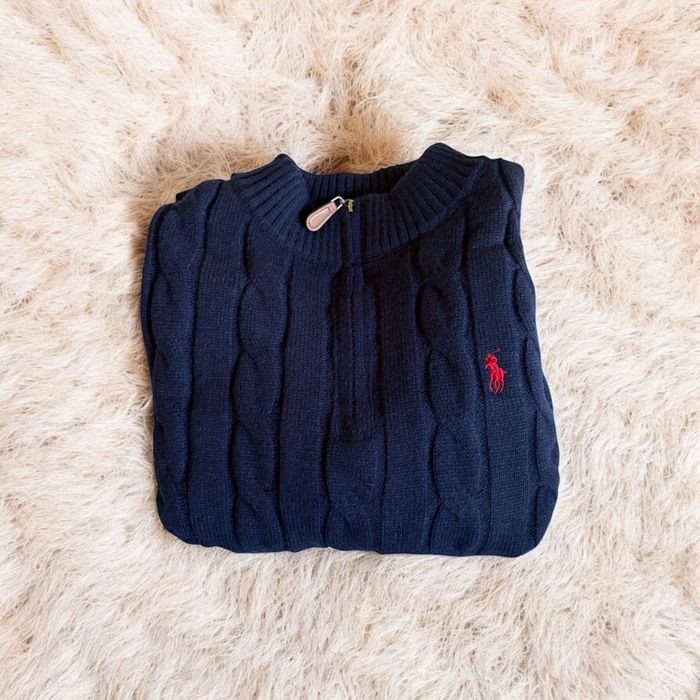 Pull Ralph Lauren en maille torsadée, de couleur bleu marine, avec le logo brodé rouge sur la poitrine. Modèle avec col montant et demi-zip, parfait pour un look élégant et décontracté. Porté uniquement 2-3 fois. ⚠️ Étiquette au cou manquante suite à un grattage, mais cela n'affecte en rien la qualité du pull. Taille : L État : Très bon état (hors absence d'étiquette) Matière : Coton/maille Négociable possible dans la mesure du raisonnable ! Prix du pull sur internet : 219€