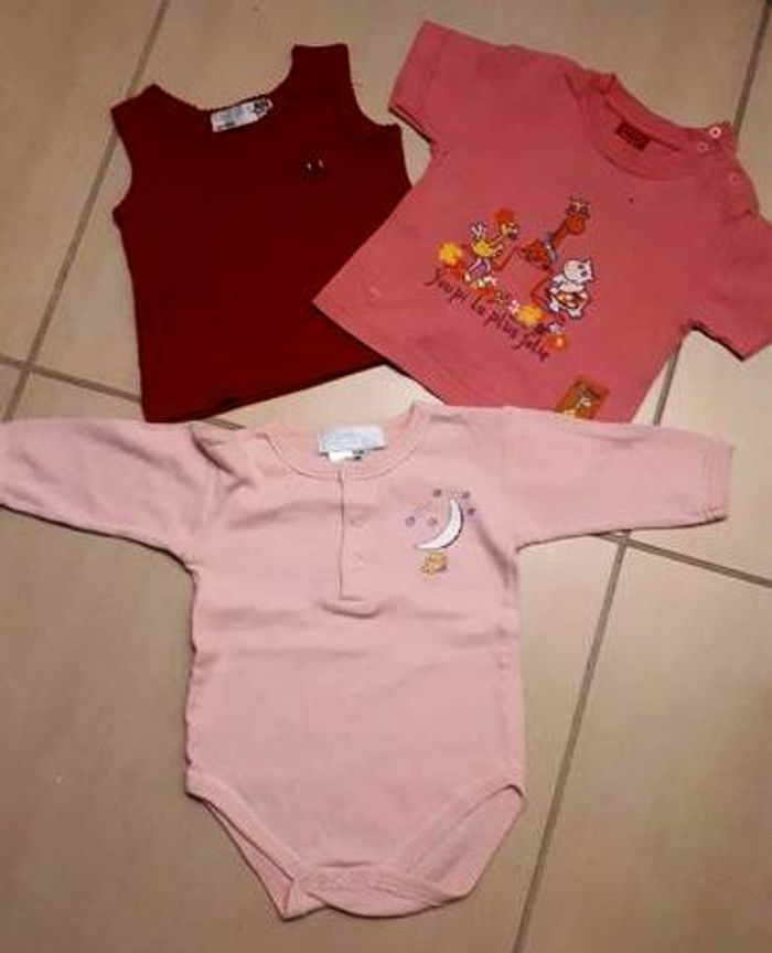 Lot bébé 3 mois Lot composé d'un débardeur rouge Mini Gang, d'un t-shirt rose "Youpi, le plus jolie" et d'un body. Taille 3 mois. Très bon état. Nombreux articles bébé tout âges et enfant dans ma vitrine.