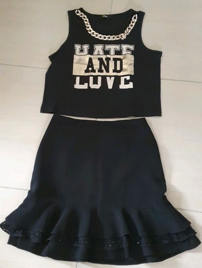 Ensemble jupe et top bijoux - Taille XS/S Ensemble FESTIF composé d'une jupe à volants avec incrustations pierreries dans les volants (XS) et d'un top avec chaine fantaisie (Taille 36). Articles neufs. Nota : je peux les vendre séparément également (9 € pièce)