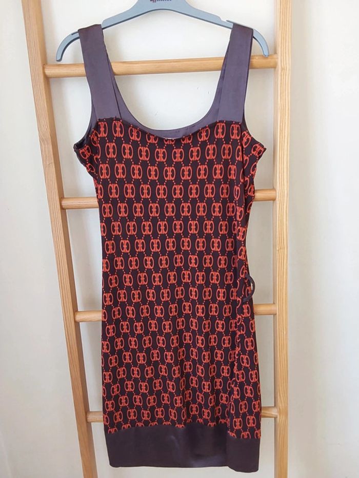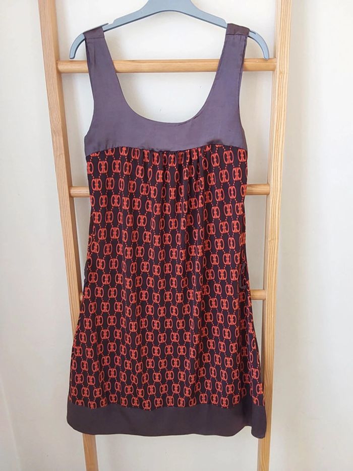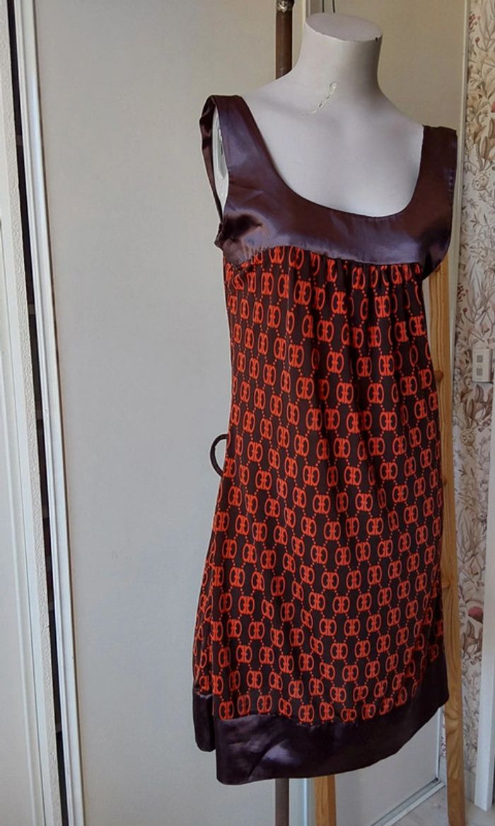 Robe polyester et satin marron orange rétro vintage T 38 - photo numéro 1