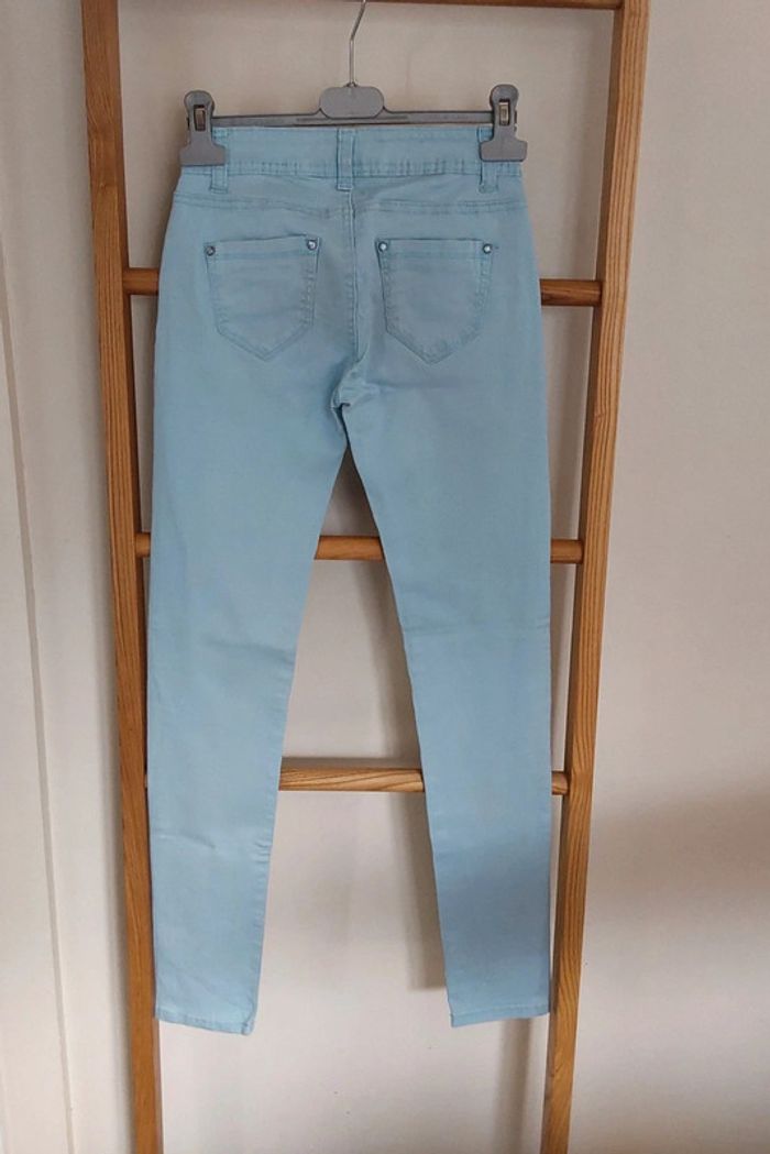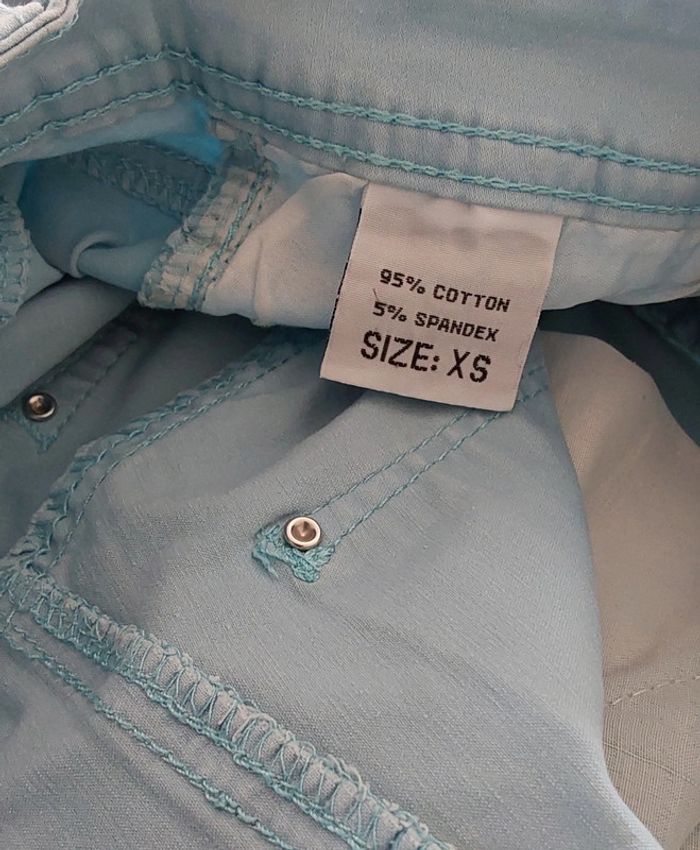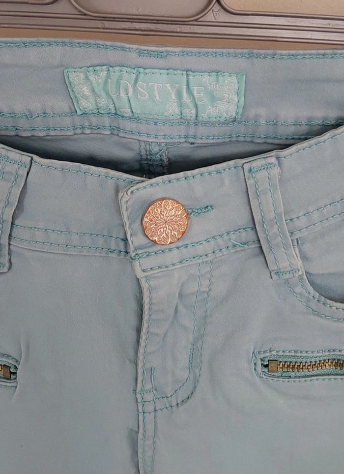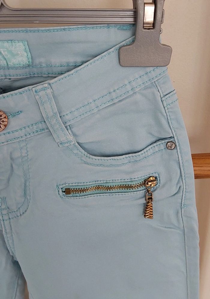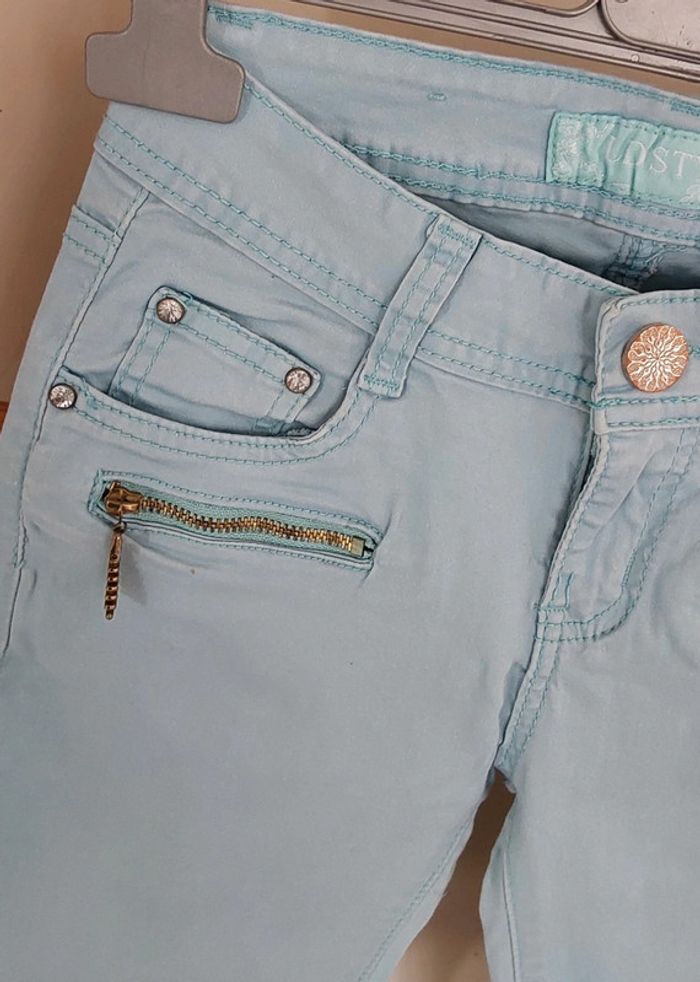 Pantalon coton bleu turquois Lostyle T 34 Bleu turquois coupe slim T34 Bouton argenté fantaisie et petits strass aux poches Pour un style hippie chic ,bohème... Mesure à plat Taille 32 cm Longueur 96 cm Entre jambe 73 cm Pour la suite de mes vêtements en 32 ou 34.... #legrenierdeprovence34 #legrenierdeprovence32 #pantalonslim34 #pantalonbleuclair34 #bleubohèmechic #pantalon3234