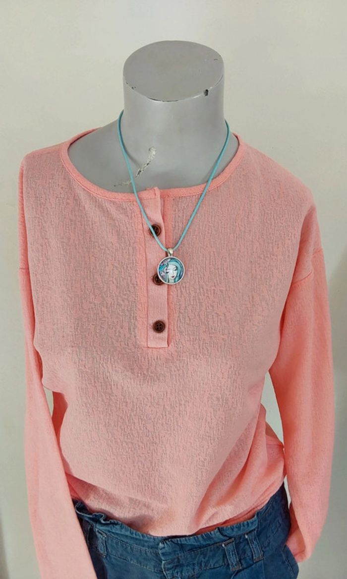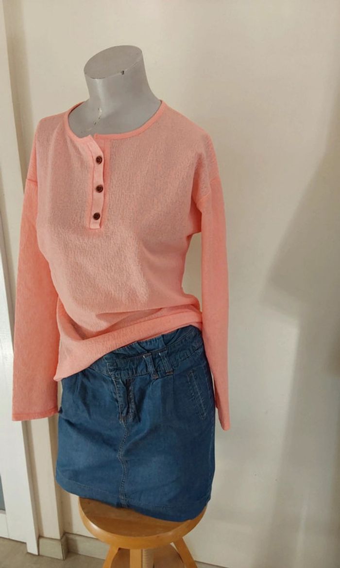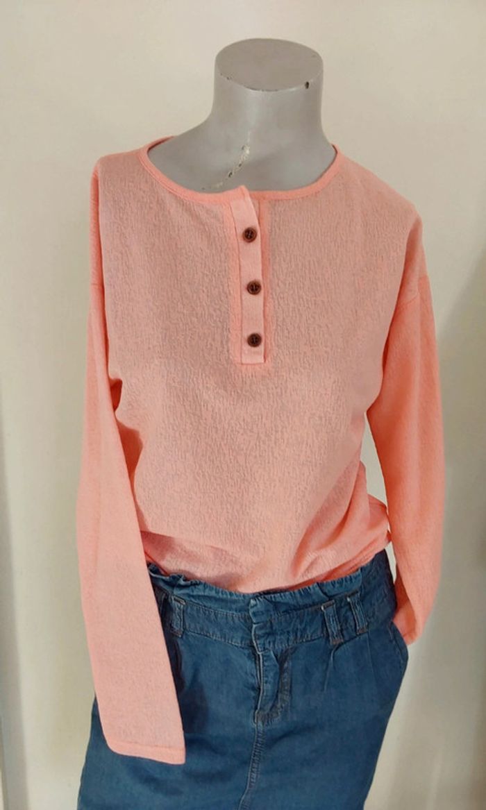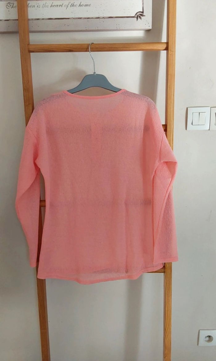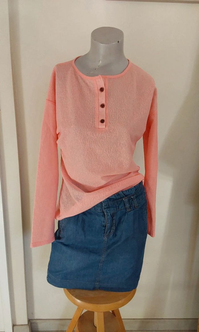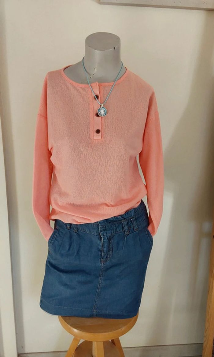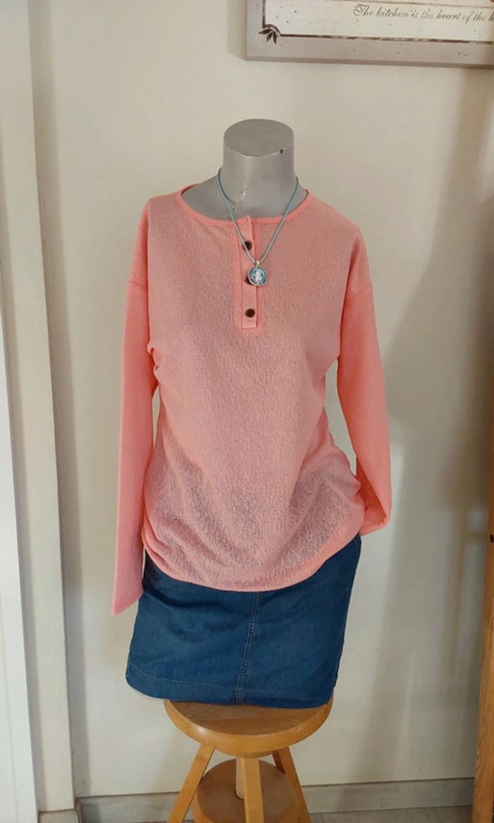 Haut blouse fluide corail T 40 Joli haut fluide corail 3 boutons à l encolure Aisselles 50 cm Longueur 65 cm Tissu polyester aspect "dévoré, très très légèrement transparent (Jupe et collier en vente dans mon dressing😉) #legrenierdeprovence40 #vintage #hautfluide40