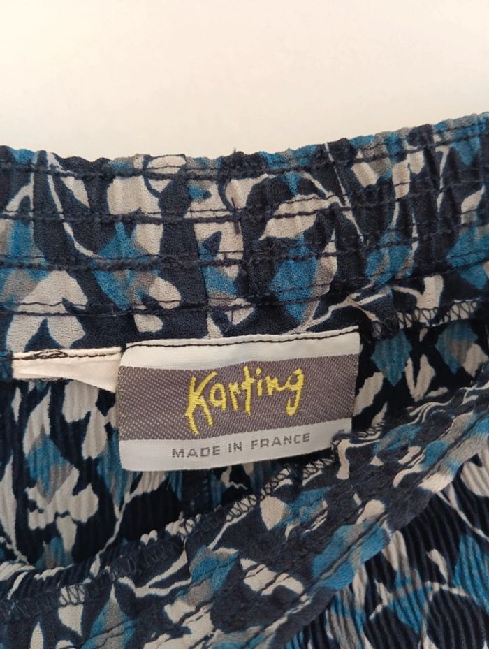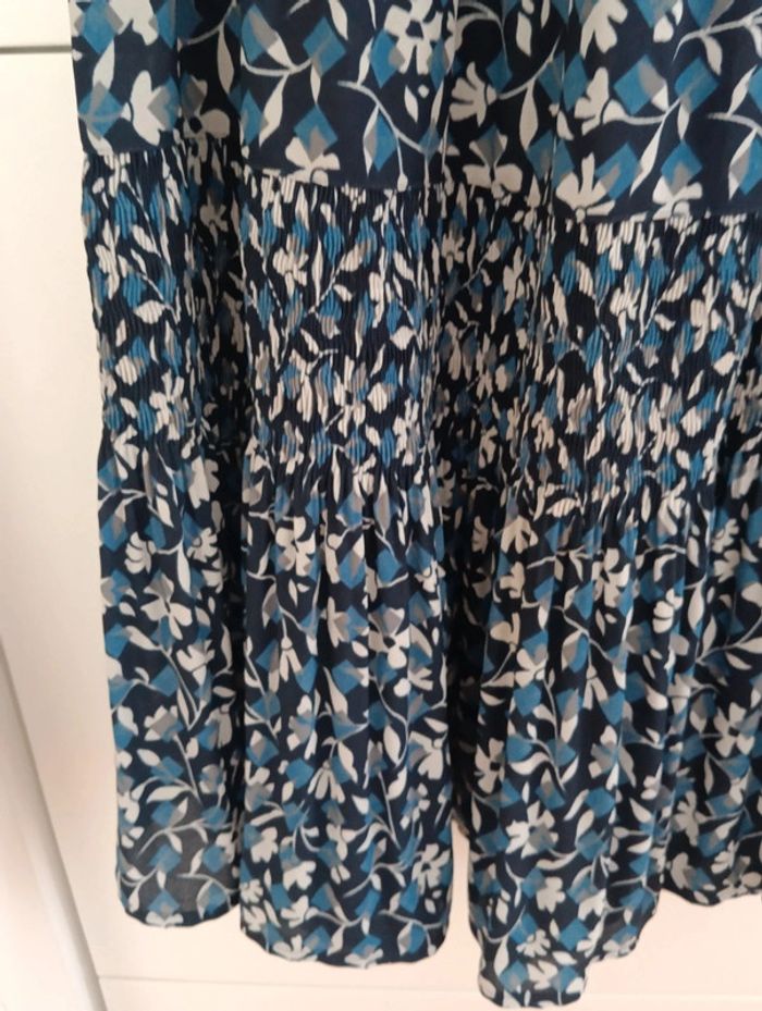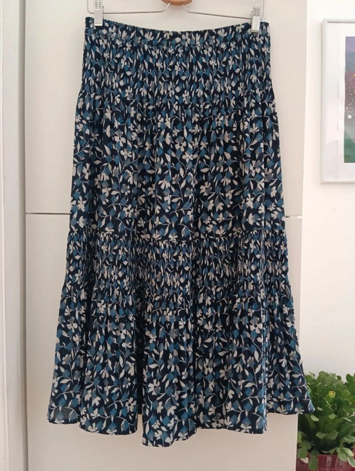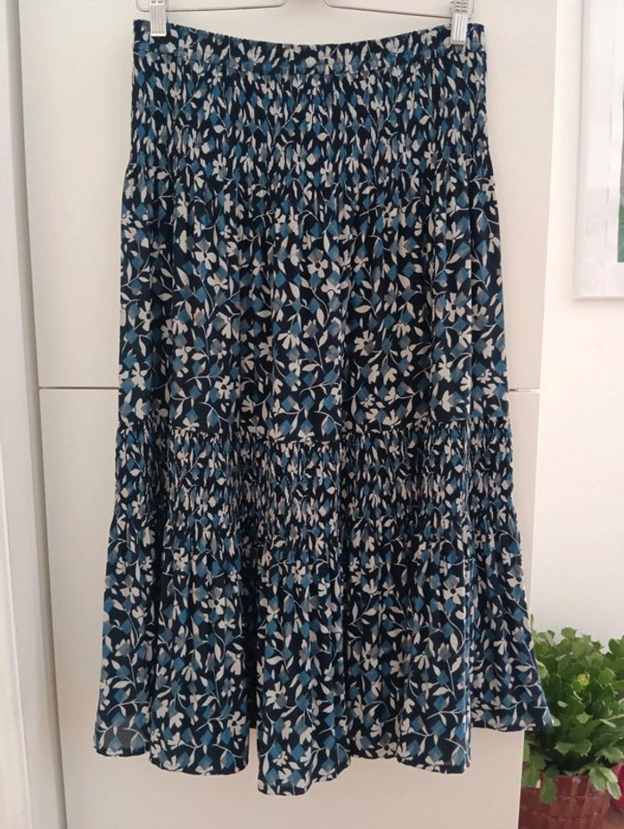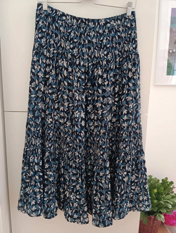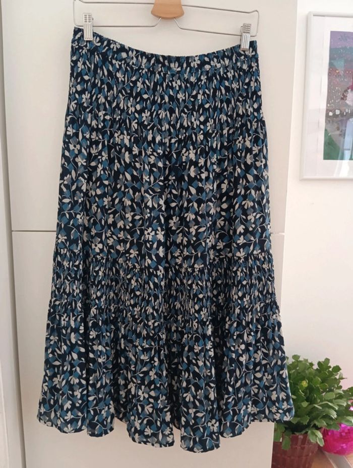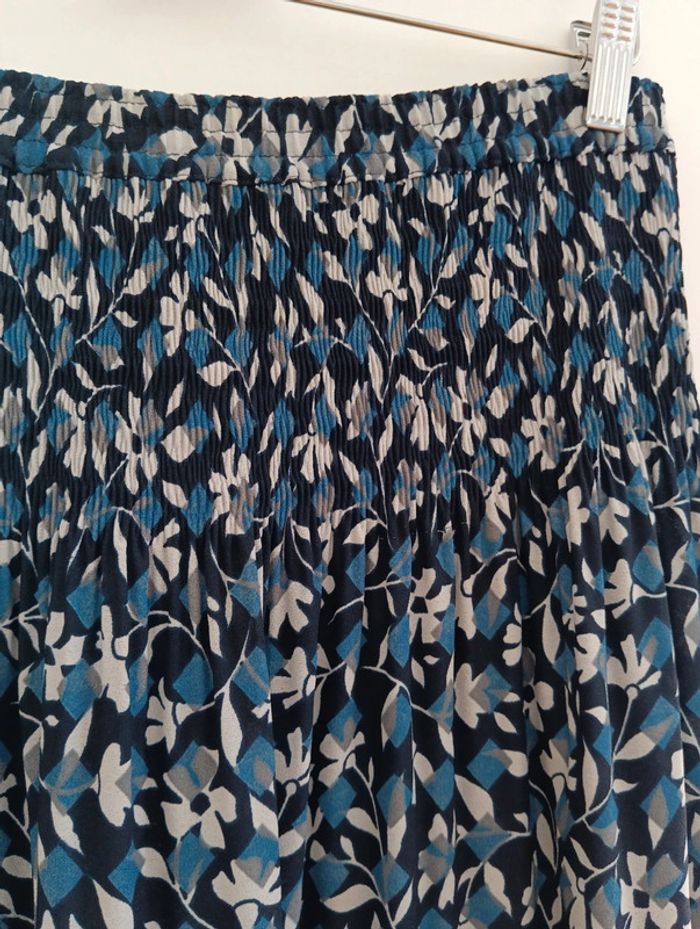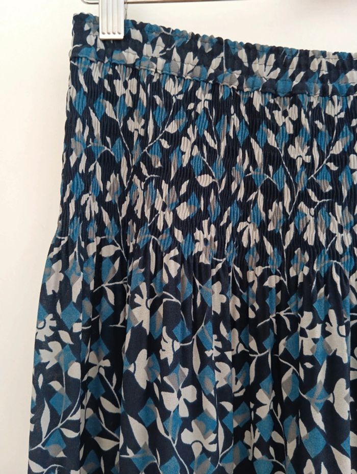 Jupe vintage midi fleurie bleu longueur midi Taille élastique Effet fry Taille 40 Estimée à confirmer avec les mesures Taille extensible de 37 à 49cm Longueur 80cm
