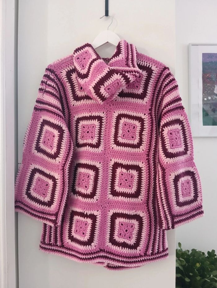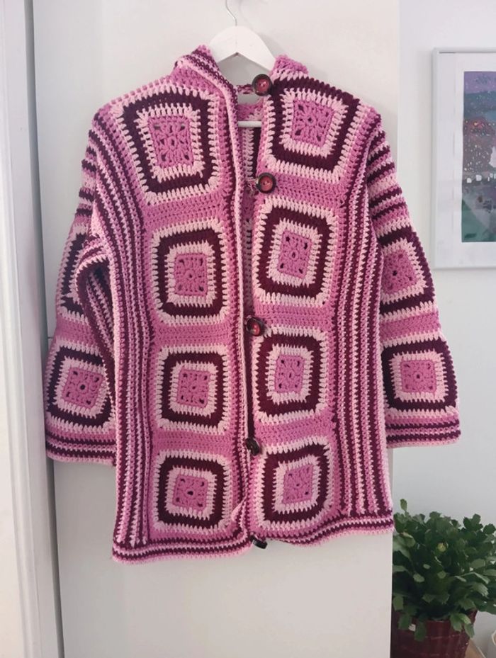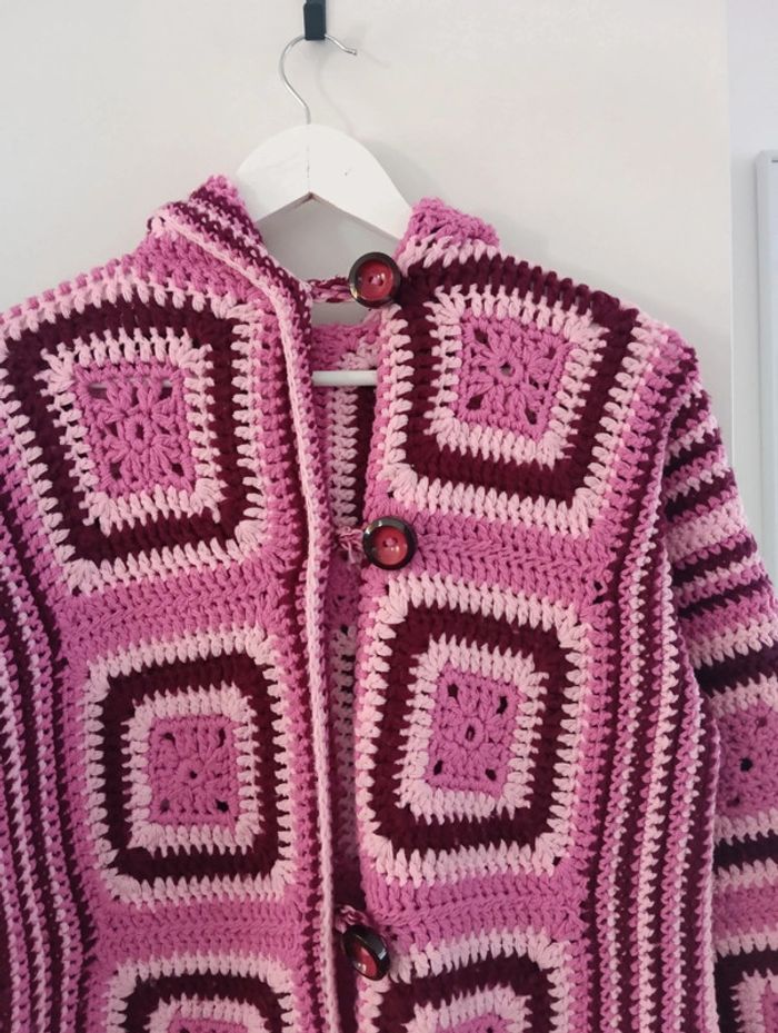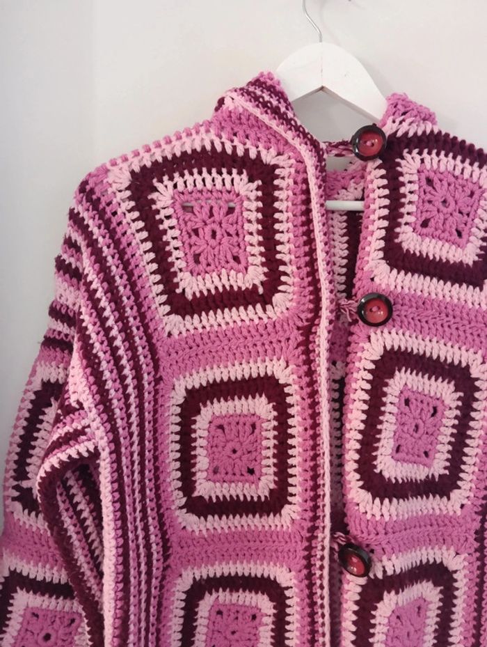 Gros gilet a capuche vintage crocheté rose handmade - photo numéro 1