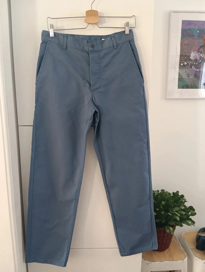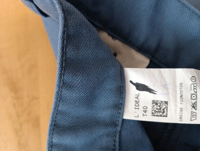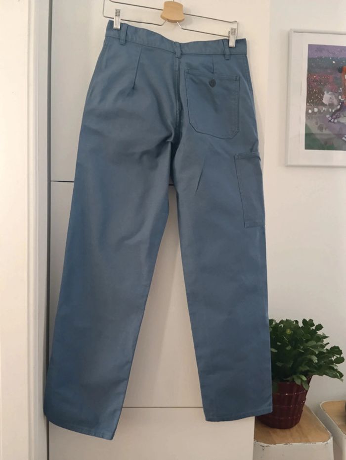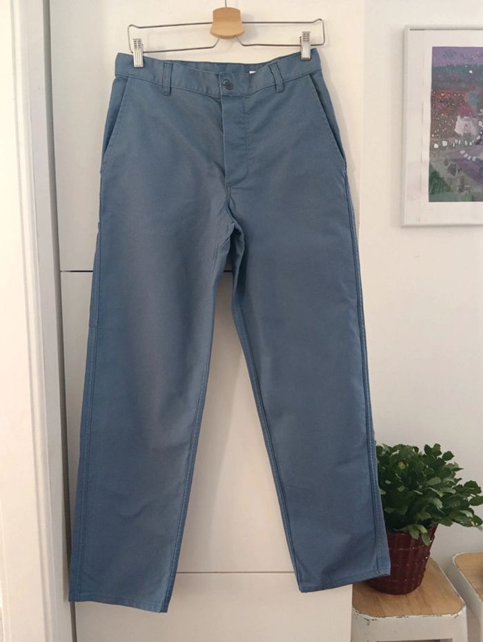 Pantalon de travail 100% coton bleu/gris Très cool a porter tous les jours, superbe qualité. taille 40 Mesures Taille 40cm De la taille à l'entrejambe 29cm Longueur 105cm