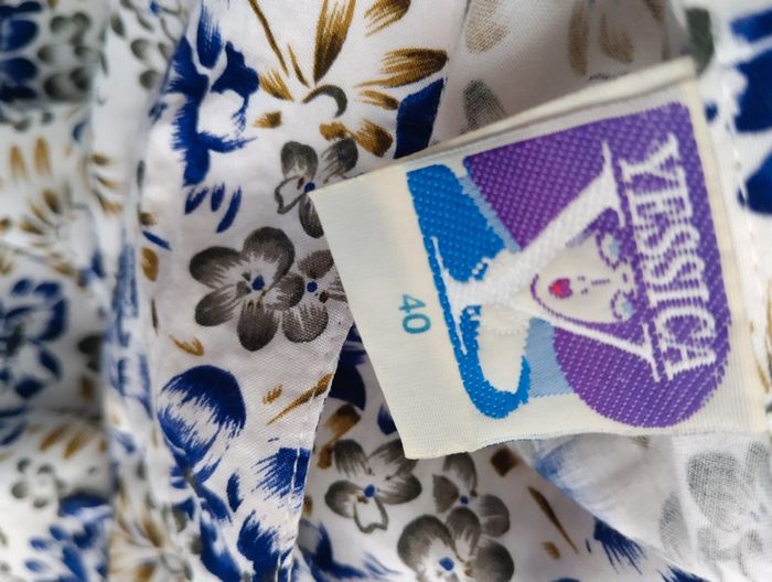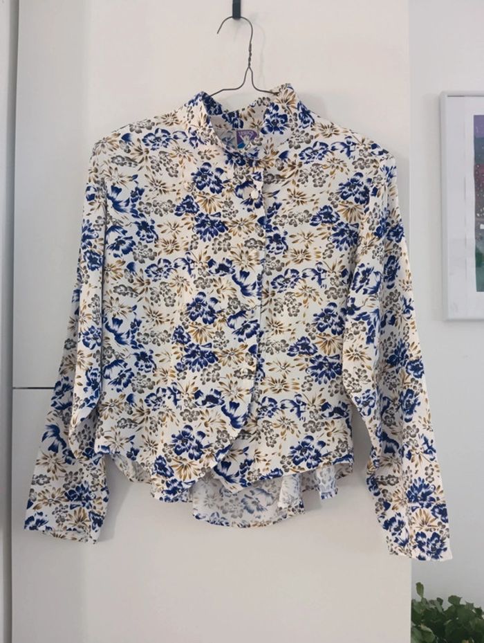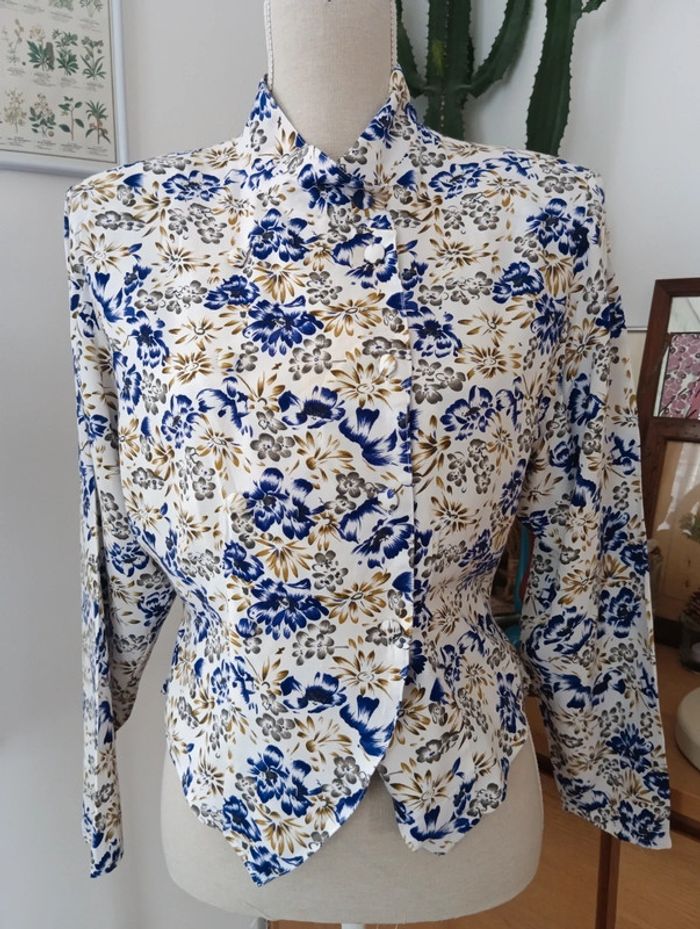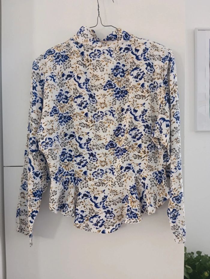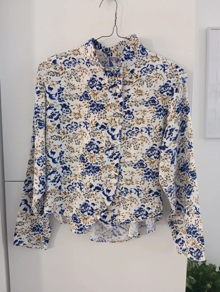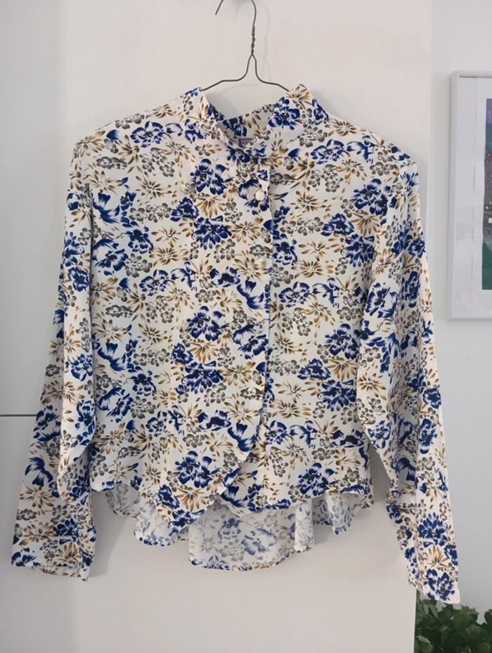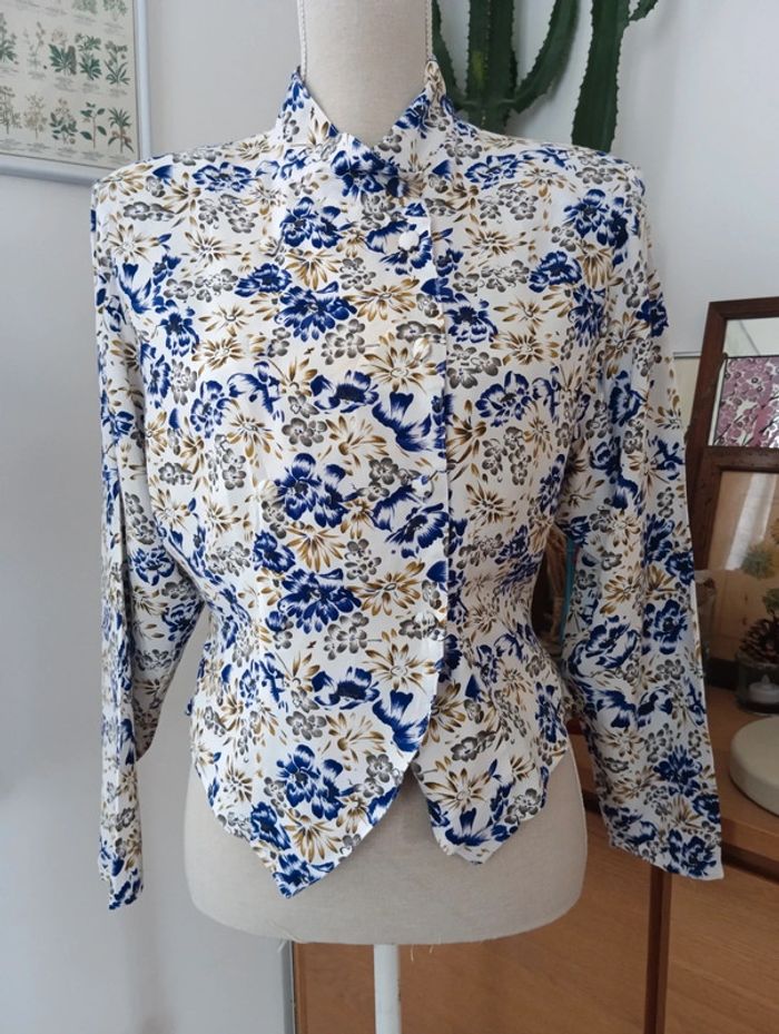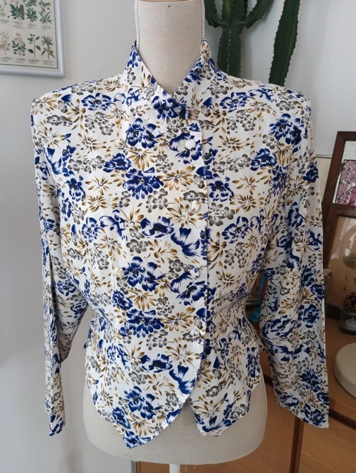 Chemise vintage à fleurs double boutonnage Manches longues, A épaulettes, Effet volanté au bas, plus long à l'arrière Taille 40 estimée à confirmer avec les mesures Epaules 43cm Aisselles 51cm Longueur 55cm