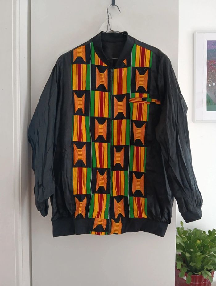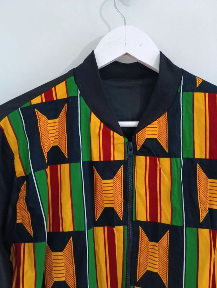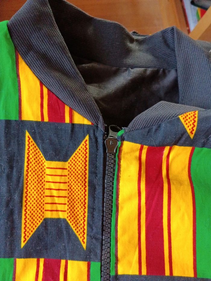 Blouson veste imprimé wax, Coupe teddy, bombers Magnifique coton, Intérieur satiné. Taille 42 estimée Mesures Epaules 43cm Aisselles 60cm Longueur 76cm Peut se porter de l'autre côté mais la tirette de la fermeture n'est pas adaptée.