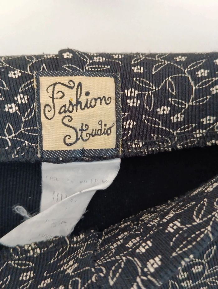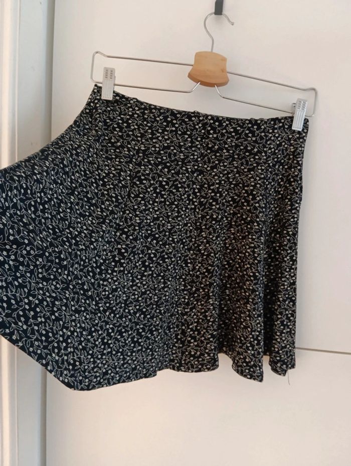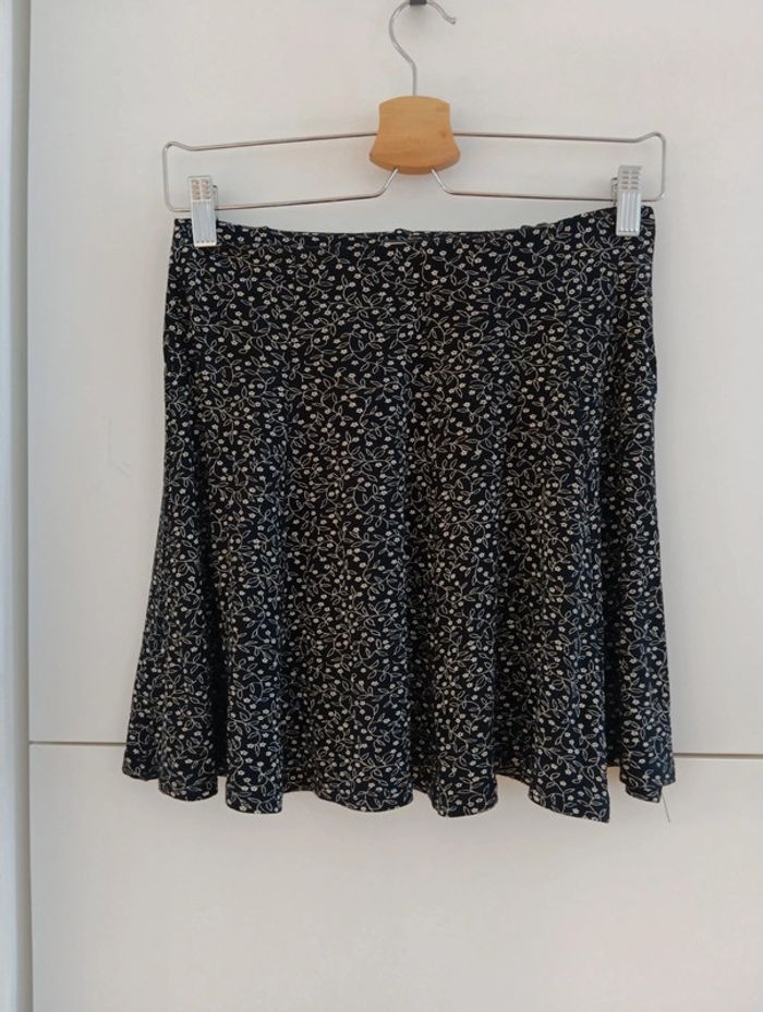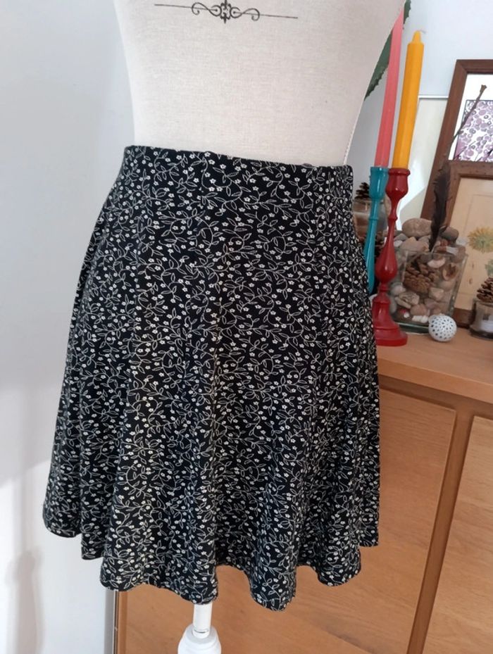 Jupe vintage courte patineuse qui tourne Fabriquée en France, Noire à petites fleurs blanches, plutôt épaisse Large taille élastique. Mesures Taille extensible de 33 à 48cm Longueur 42cm