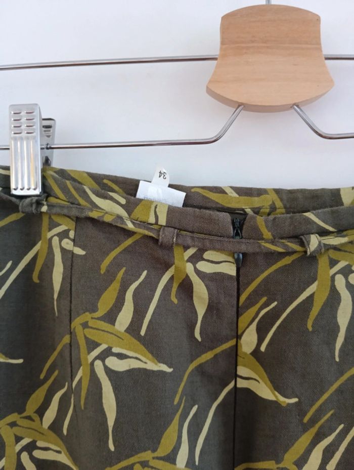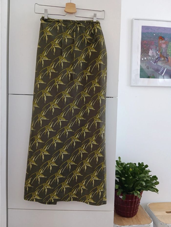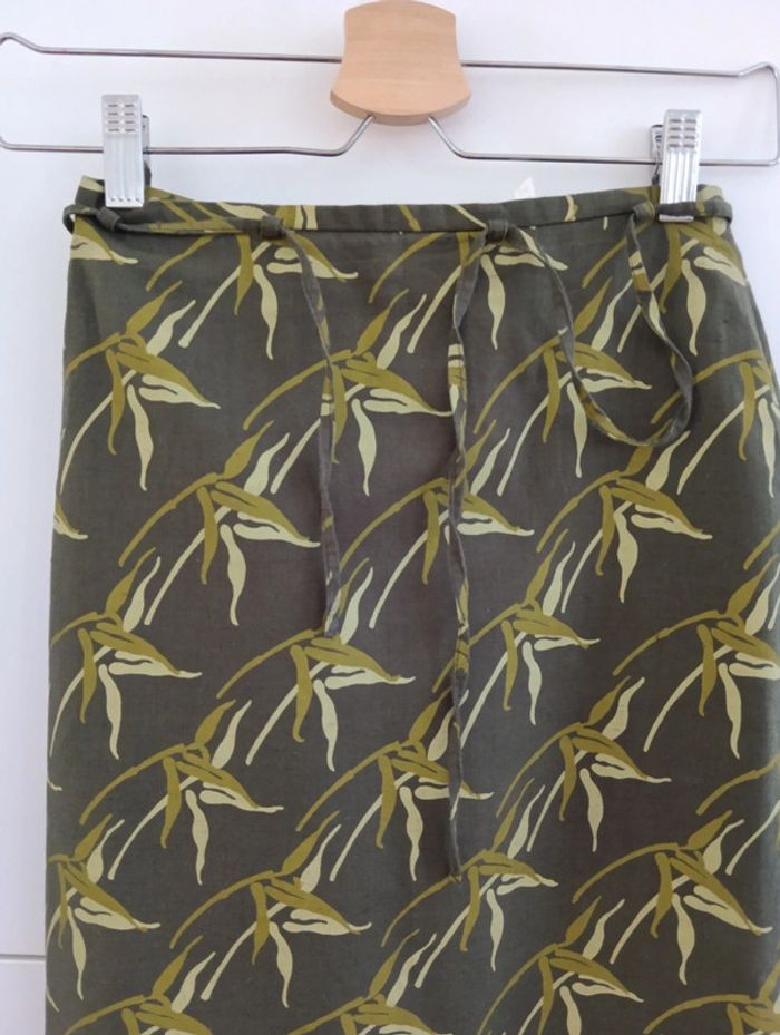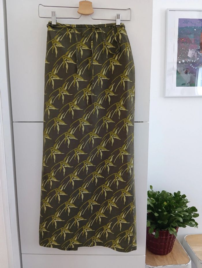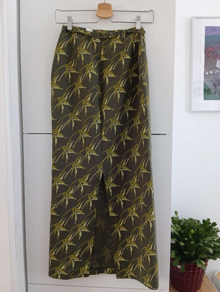 Jupe longue verte coupe droite Fermeture éclair au dos Fendue à l'arrière au milieu 54% Lin 46% coton Mini lien à la taille. Mesures Taille 30cm Longueur 97cm