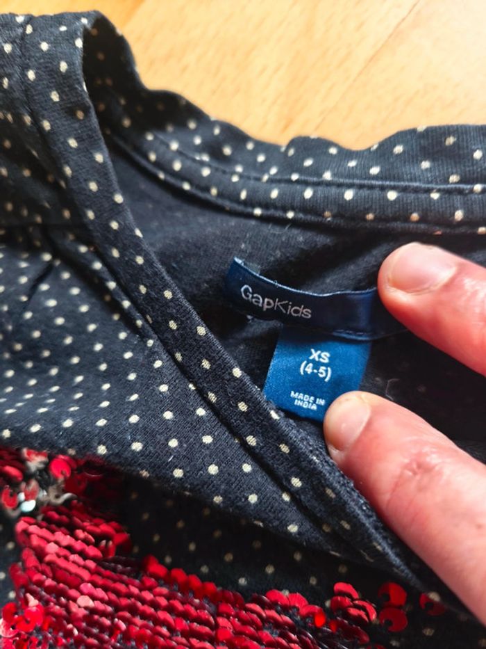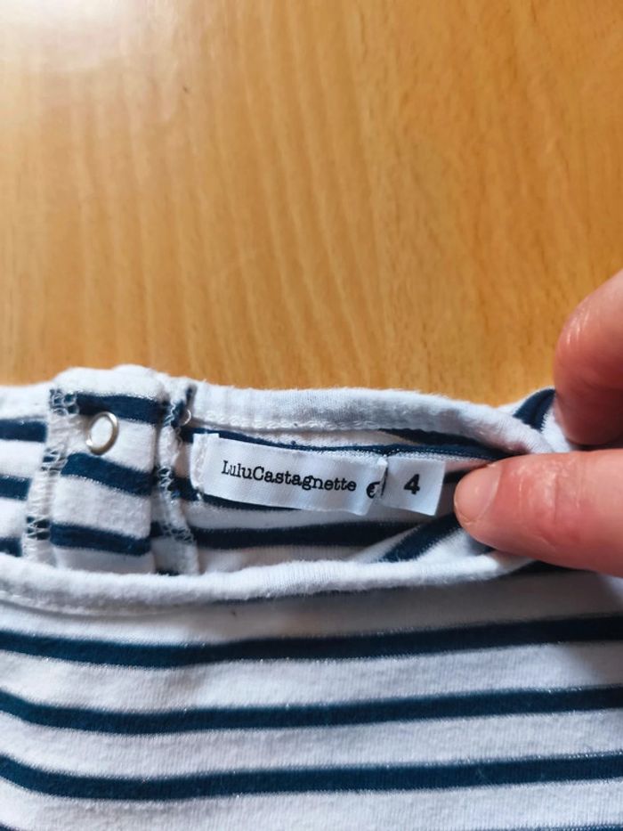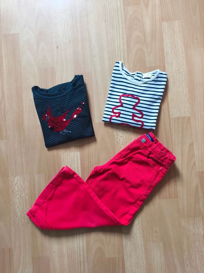 Tenue 4 ans composée : - d'un Tee shirt noir à pois avec sequins marque GAP en BE - d'un tee shirt blanc rayé avec sequins marque Lulu Castagnette en BE - d'un jean flare marque Okaïdi neuf (couleur moins vive que sur les photos) 💐D'autres articles de la même taille #virginwoodygirl4a