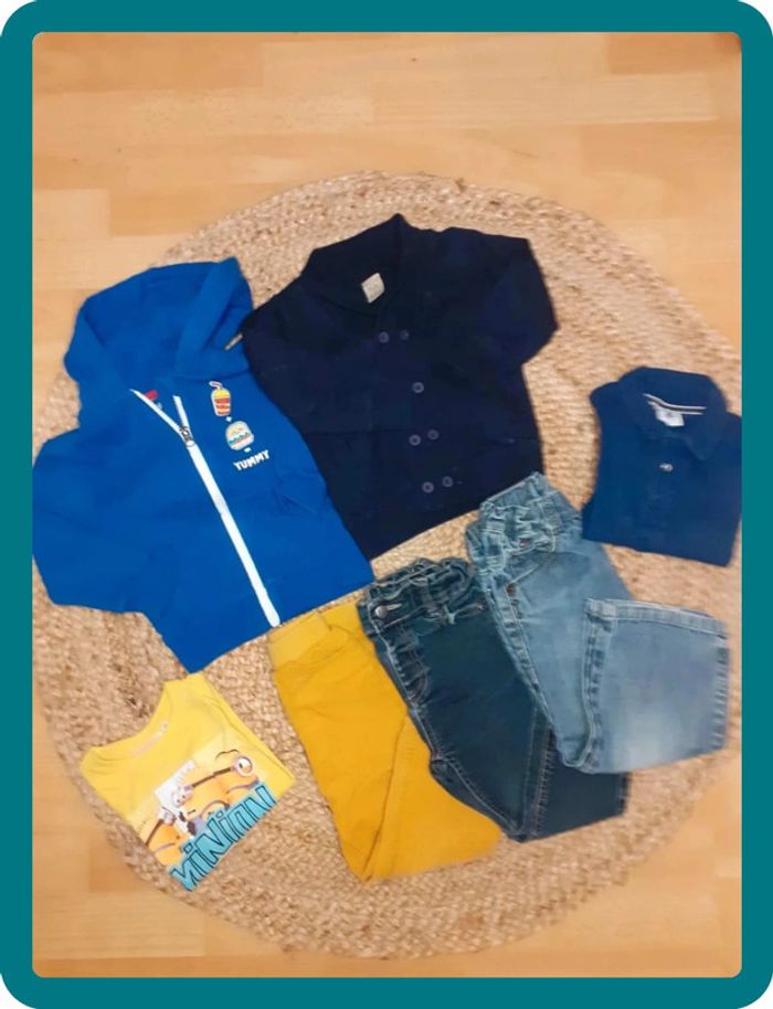 Lot de 7 pièces taille 24 mois et 2 ans composé : - d'un pantalon velours jaune Boîte à Malices en TBE - d'un jean slim Boîte à malices en BE - d'un jean marge Kidkanai en BE - d'un polo marine manches longues Petit Bateau 24 mois en BE - d'un gilet marine boutonnée sur le devant Boîte à malices en TBE - d'un gilet bleu à capuches Lupilu en TBE - d'un tee-shirt Les Minions manches longues en TBE 🐯D'autres articles de la même taille #virginwoodyboy2a