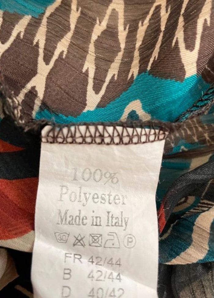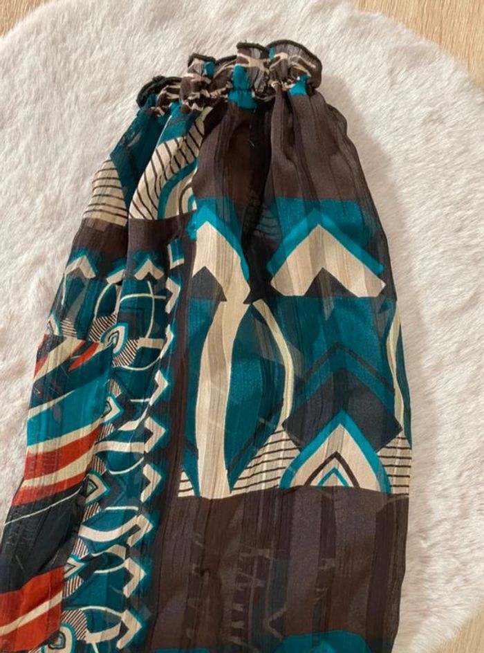 En excellent état 🌟 🦋 Jolies couleurs : bleu pétrole, marron, orange et beige 🧶 Matière transparente 🫶🏼 Col large et très élastique 💫 Manches bouffantes resserrées aux poignets 🌸 Resserré aussi en bas Taille 42/44