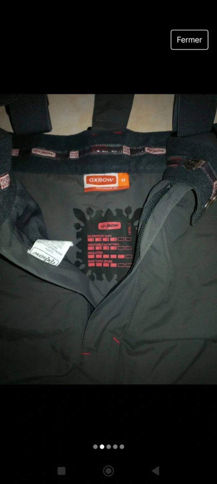 Pantalon ski homme taille m de marque Oxbow. Des traces d'usures sur le bas du pantalon (voir photo) et il manque le crochet pour fermer le pantalon mais il y a les 2 boutons pression qui suffise pour le fermer (photo 3).
