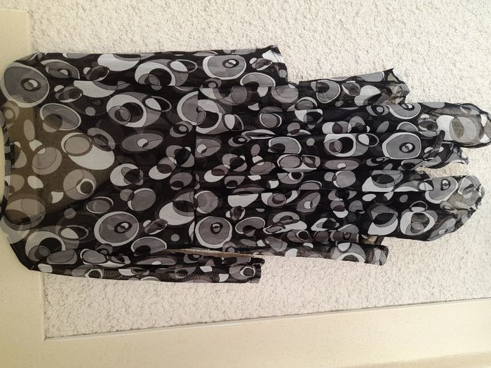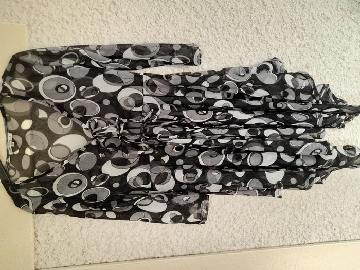 Vends surchemise légère noire et blanche. Tissu transparent. Fermée sur le devant par 3 lacets. Base asymétrique. Manches 3/4